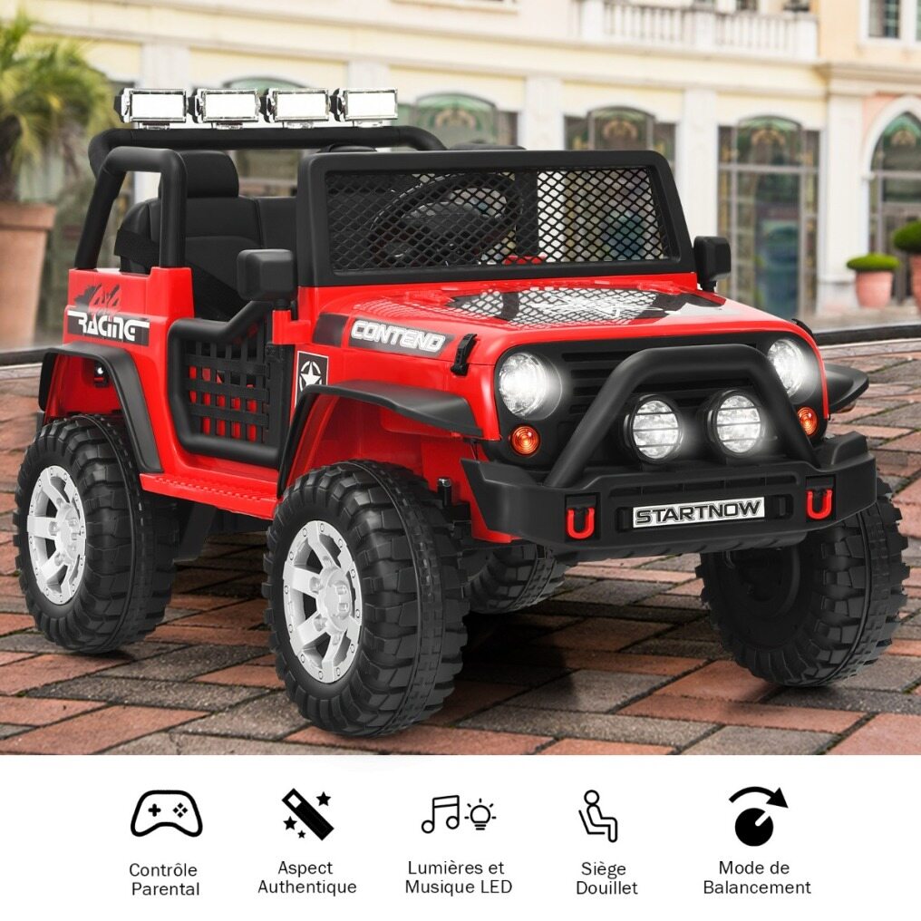 【Realistic Driving】Opening doors, a mesh front window, and a steering wheel—all the exquisite details are imitated from the real vehicle. Our car roars when you press the pedal, the horns beep, and thanks to the LED lights, your little one enjoys the most realistic driving experience possible. The car moves forward and backward and also has a rocking mode.