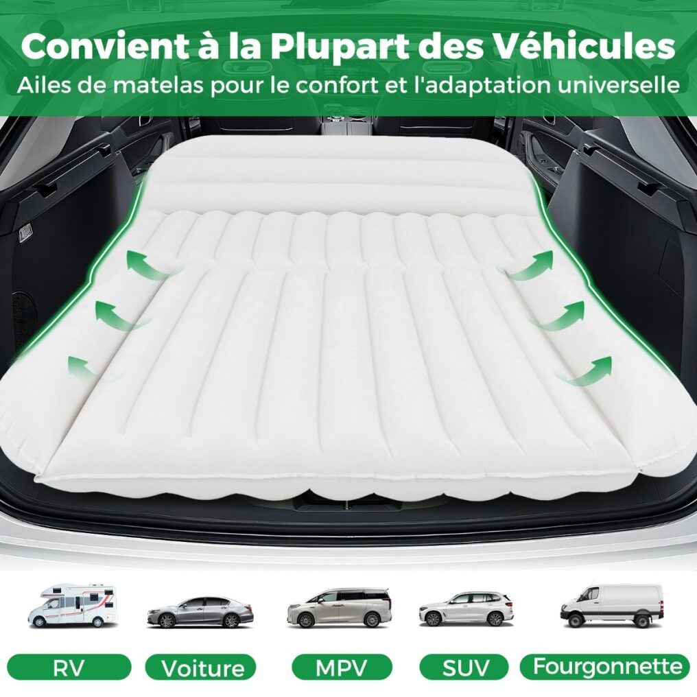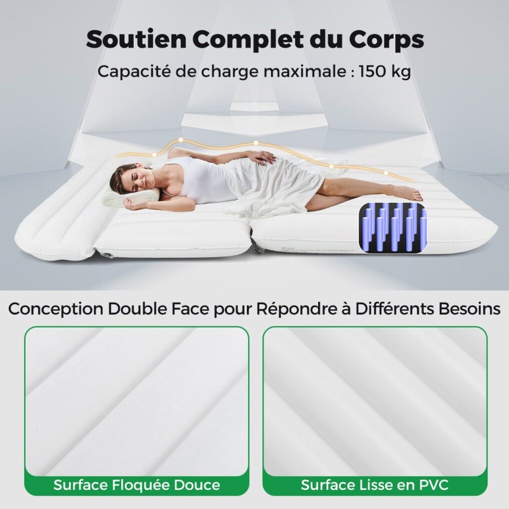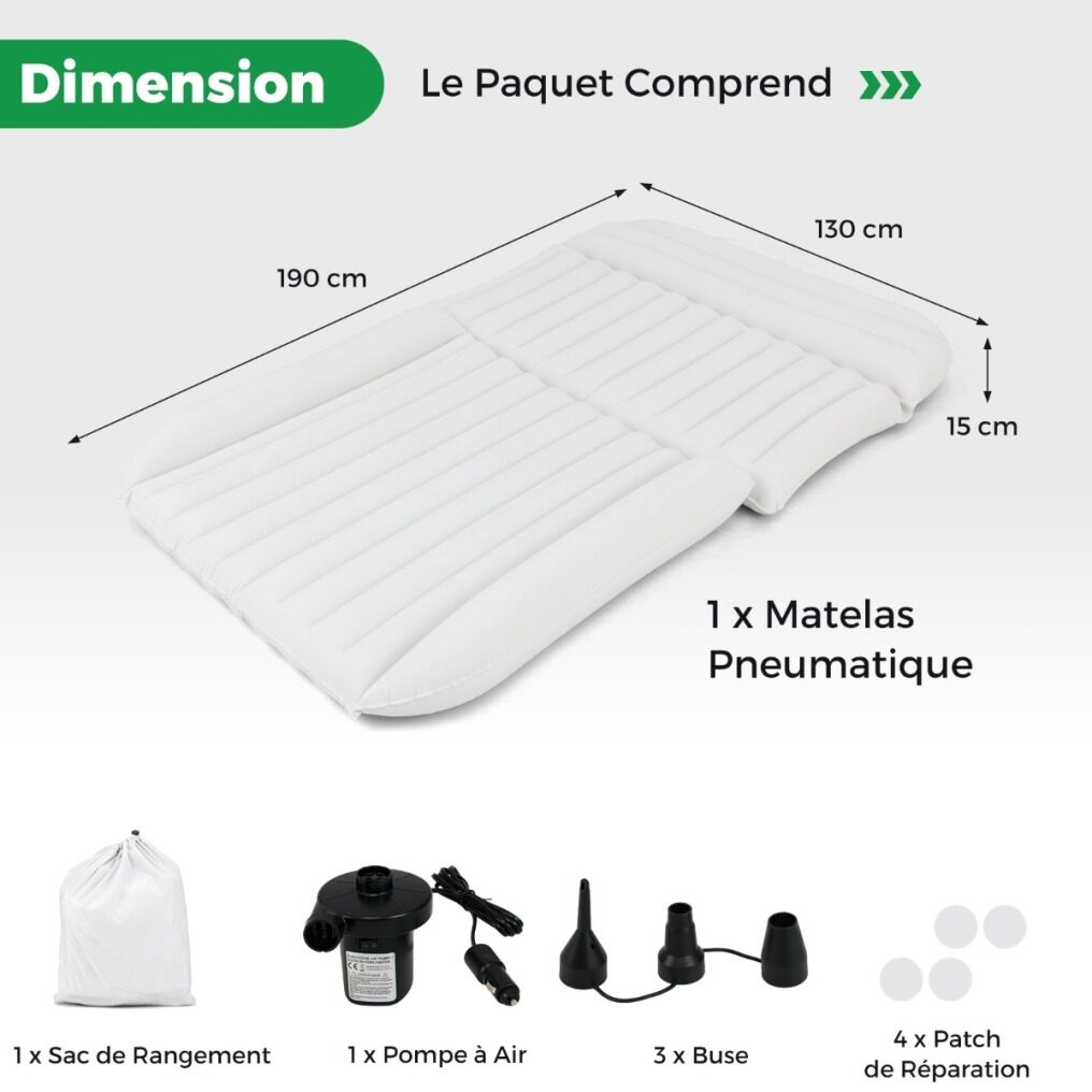 【Spacious and Comfortable Inflatable Mattress】This inflatable mattress offers you a restful sleep, measuring 190 cm x 130 cm with a thickness of 15 cm. Its 7 independent air chambers, including 2 support wings, allow you to inflate the mattress fully or partially depending on the space available in the back of your car.