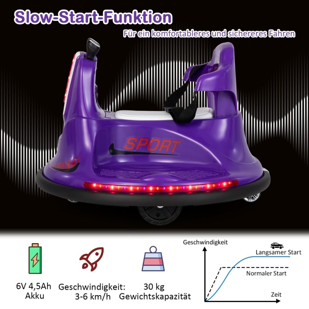 Our 6V bumper car is a perfect gift for kids ages 37-95 months. This bumper car lets kids ride, race, bump or spin happily. Illuminated LED edges, music, horn and stories bring more fun to kids. Two joysticks help kids control the vehicle manually while the remote control allows parents to stop the car if kids operate it wrong. With durable wheels, it can move or steer flexibly in all directions. Besides, our toy car not only provides hours of fun but also features a protective design. It has a speed of 3-6 km/h and a slow start system, making it safe to use. In addition, the comfortable backrest with adjustable seat belt protects kids from tipping over. The wide footrest with non-slip design allows kids to place their feet. In addition, with a soft bumper, it is able to cushion collisions.