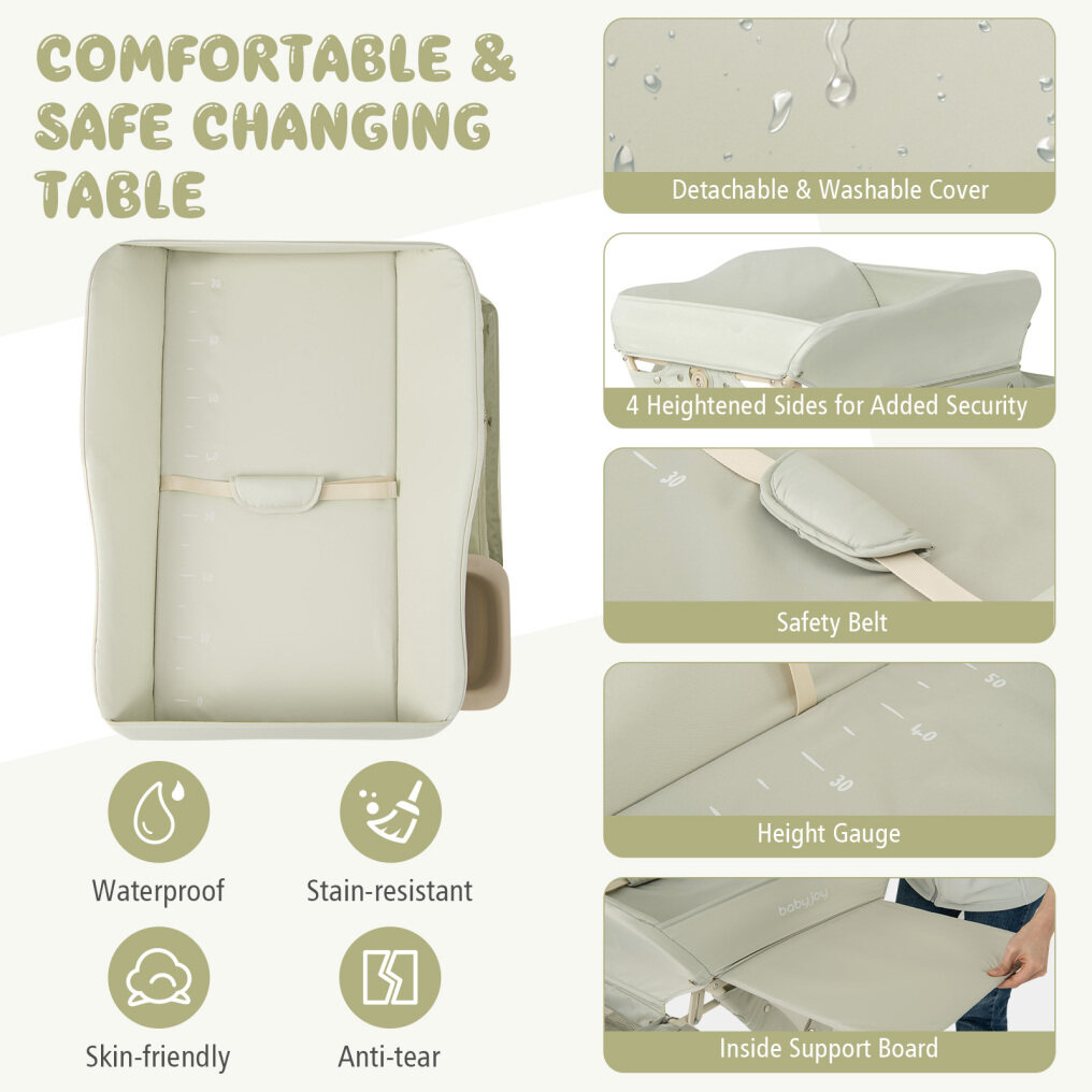 More Safe and Thoughtful Features: The 4-sided heightened sides around the table top and the safety belt with soft padded cushion work together to create a secure environment for your baby. Moreover, the height gauge on the diaper changing pad allows you to record your baby's growth every day!