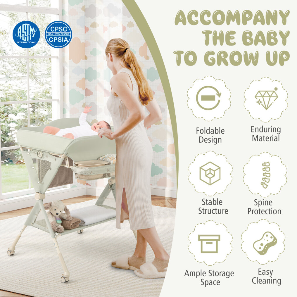 One-Click Folding Design and Easy Movement: Just press the button on both sides, the infant nursery organizer can be folded into a compact size to save space when not in use. Additionally, this changing table comes with 4 lockable and detachable universal wheels with 360° rotation, safety brake, and low noise.