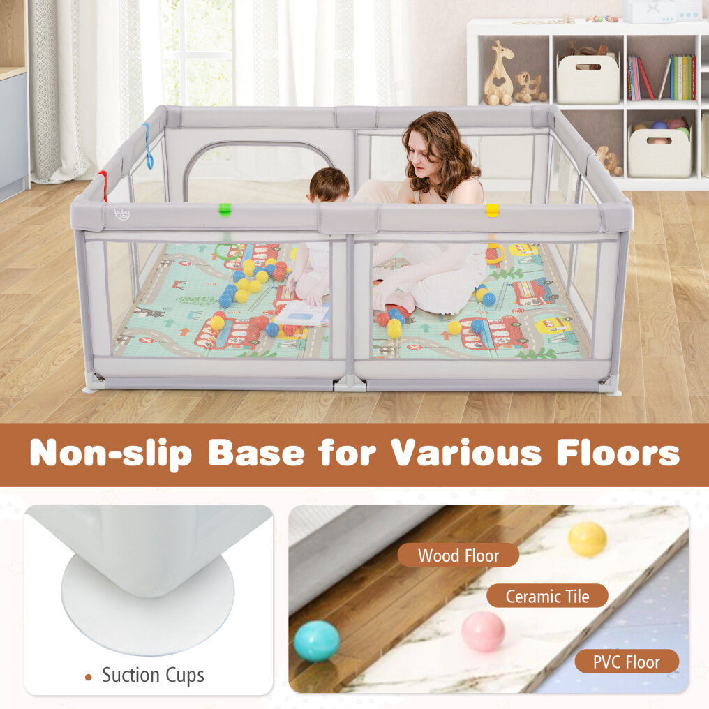 ● Stable and Non-slip Construction: Constructed from robust metal tubes with firm PP connectors, this baby playpen ensures excellent stability and durability. The non-slip suction cups enhance the stability of the playpen on different floors, including ceramic tile, wood floor, PVC floor and carpet.