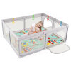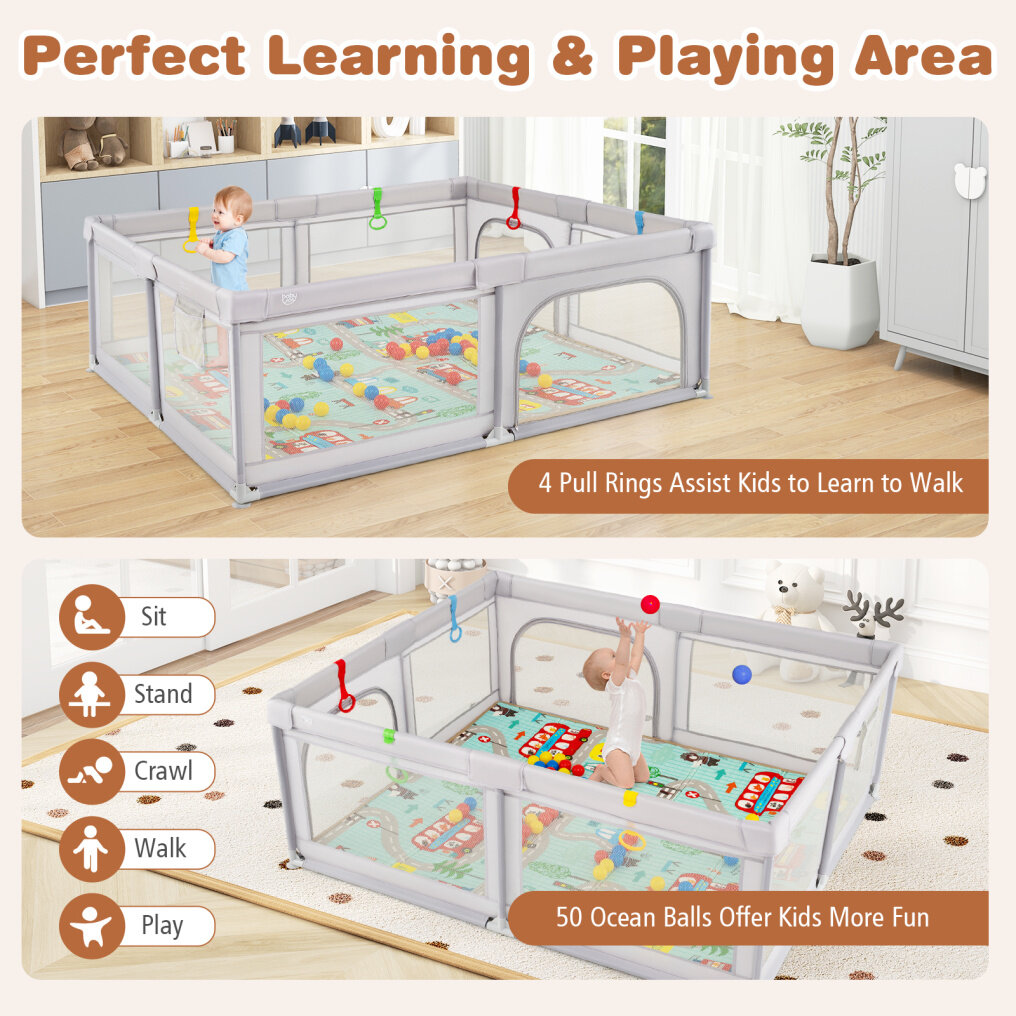● Perfect Learning and Playing Area: This 73" x 61.5" large baby playpen features a double-sided colorful baby mat and 27" scientific height that provides a safe and cozy space for babies to sit, stand, crawl, walk or play. In addition, 4 pull rings assist kids to learn to walk and 50 ocean balls offer kids more fun.
