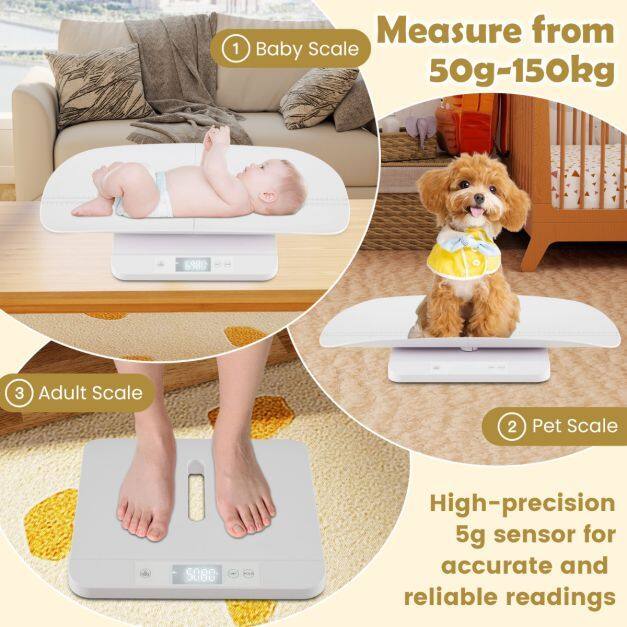 High Accuracy and Wide Range: This baby scale measures from 50 g-150 kg, making it suitable for infants, toddlers, pets, and even adults. In addition, the high-precision 5 g sensor allows for accurate and reliable readings.
