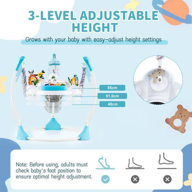 Jump, play, and grow with this all-in-one activity center! This baby jumper adapts to your child's growth with three adjustable height levels for a perfect fit and lasting comfort at every stage. Equipped with six engaging toys, including a musical tray with lights and sound effects, it encourages exploration and motor development. The 360° rotating seat allows your child to turn around to reach all the activities, while the padded seat provides comfort and softness. Cleanup is simple thanks to the removable, wipe-clean toys and machine-washable seat pad. Designed for safety and stability, this jumper meets safety standards and is reinforced with strong connections and non-slip feet.