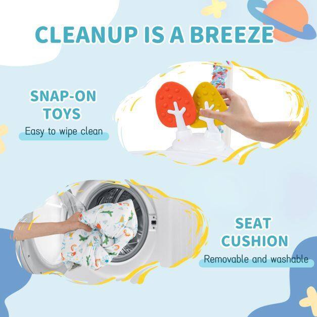 【Easy Cleaning】The clip-on toys detach easily and can be cleaned with a wipe. The removable seat cushion is machine washable for a clean and hygienic play environment.