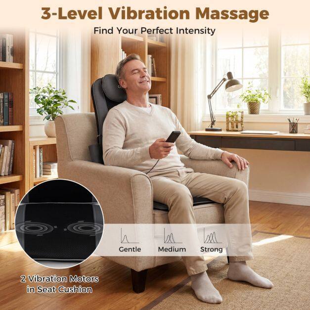 This chair back massager features adjustable straps for a universal fit, making it easy to use at home, in the office, or while traveling. It includes 4 kneading and rolling nodes that provide targeted pain relief across 3 kneading areas (upper/full/lower back) to dissolve stubborn knots precisely. Equipped with an independent heating system, this Shiatsu massager offers warmth up to 55°C with auto-off modes and safety protection for safe, cozy sessions. The built-in vibration seat motors add customizable intensity levels to relax hips and thighs, operating separately or alongside shiatsu functions. Designed for comfort, it features breathable mesh, high-density padding, a removable head pillow, and a handy side pocket to keep the controller within reach.