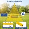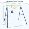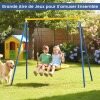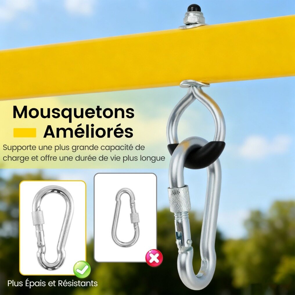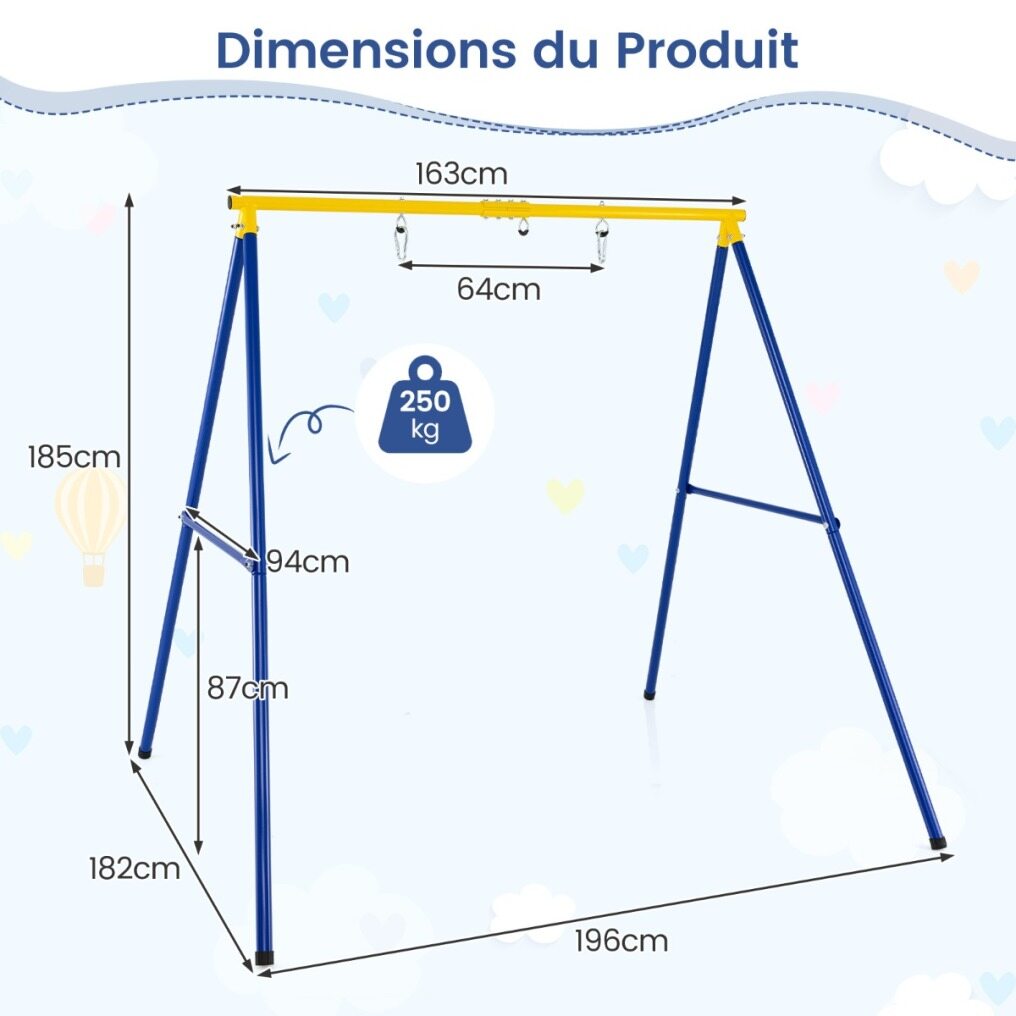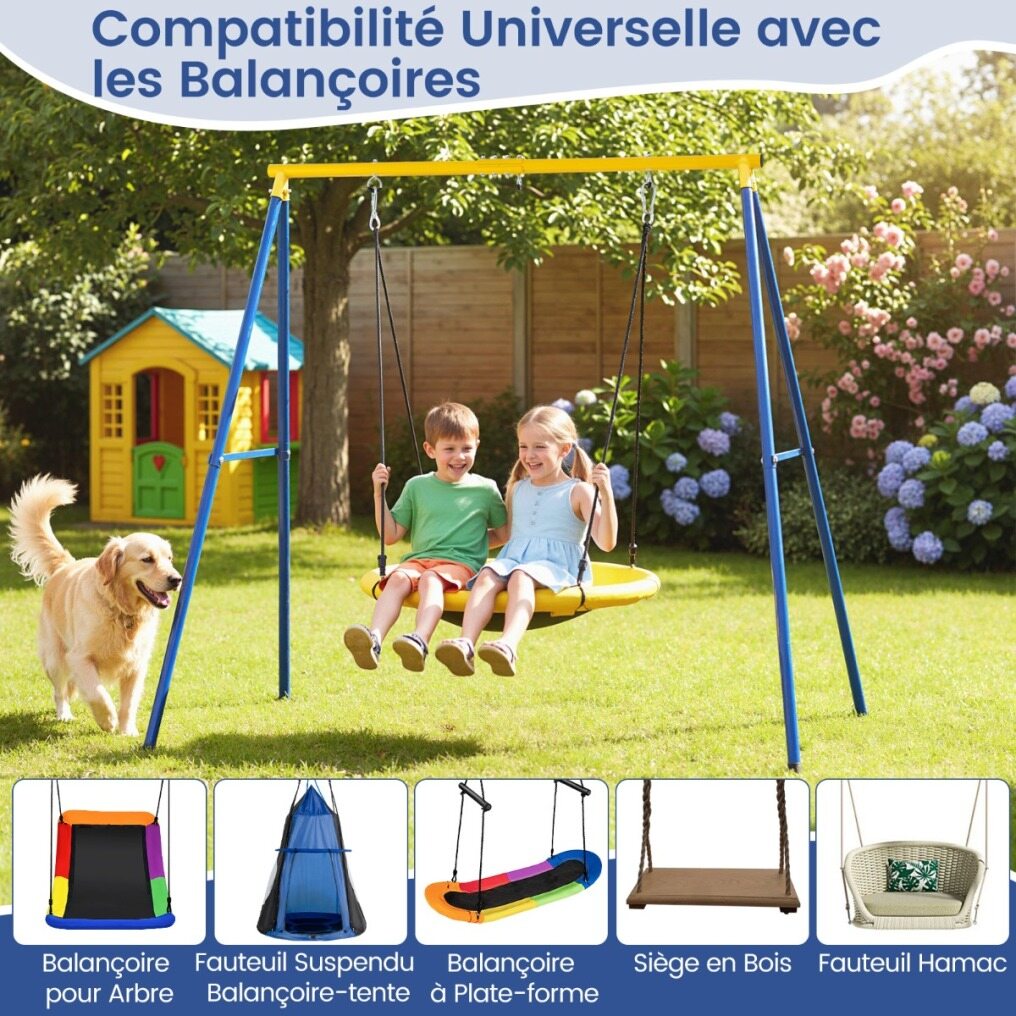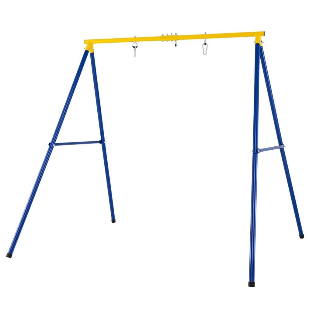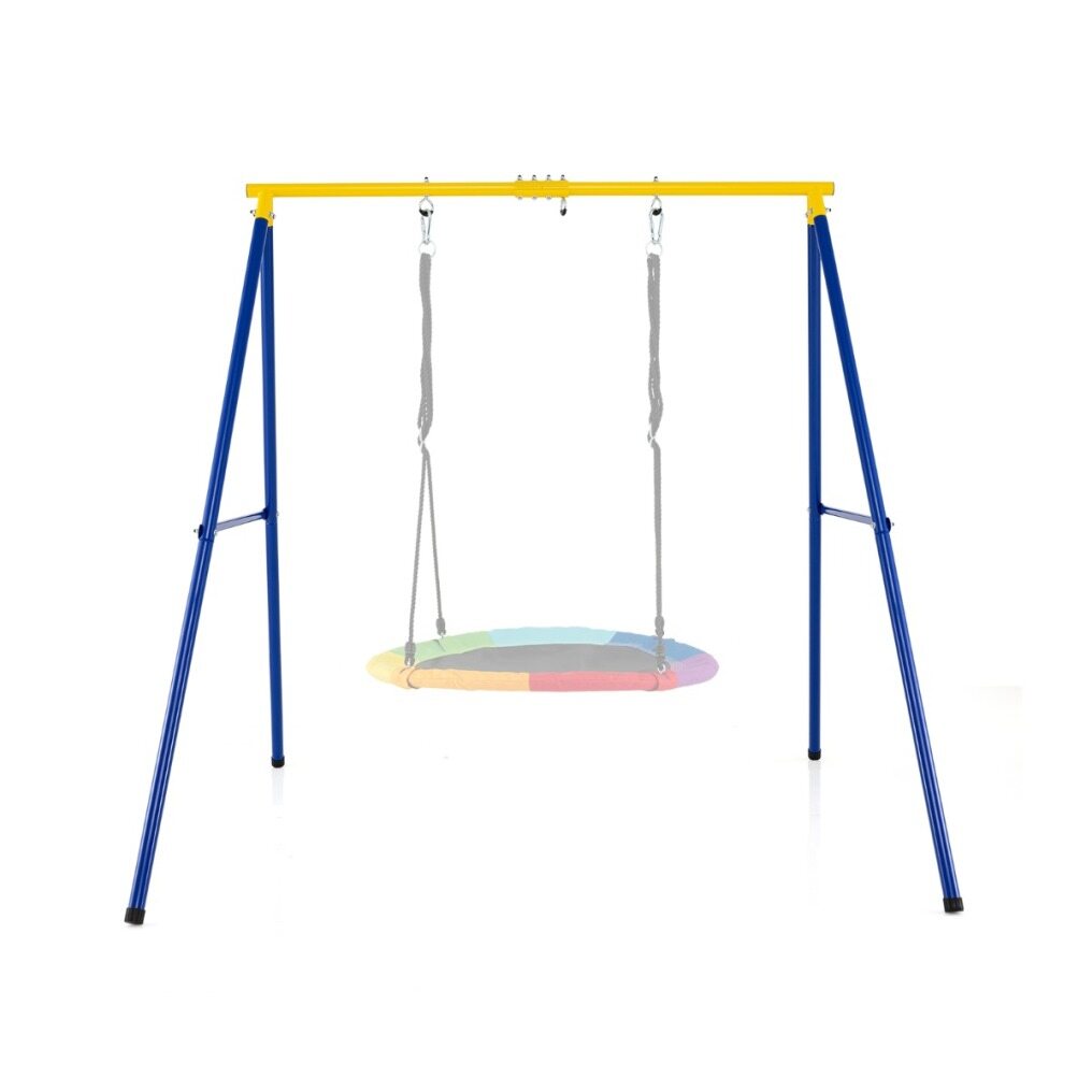 Create your own swing area in minutes and enjoy comfortable swinging indoors or outdoors. This sturdy, single-person metal frame, with thick tubes, an A-frame design, and a reinforced crossbar, provides a stable base that minimizes vibration. It supports up to 250 kg, making it suitable for both children and adults. Ideal for a good swing range without feeling cramped. Four ground stakes are included to secure the frame on grass or soft ground, and anti-vibration feet stabilize the support while protecting indoor floors. Thanks to three integrated hooks and two carabiners, you can easily install a 360° rotating rope swing or a two-rope swing, compatible with nest swings, net seats, or hanging chairs. Simplified assembly with labeled parts, tools, and detailed instructions.