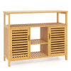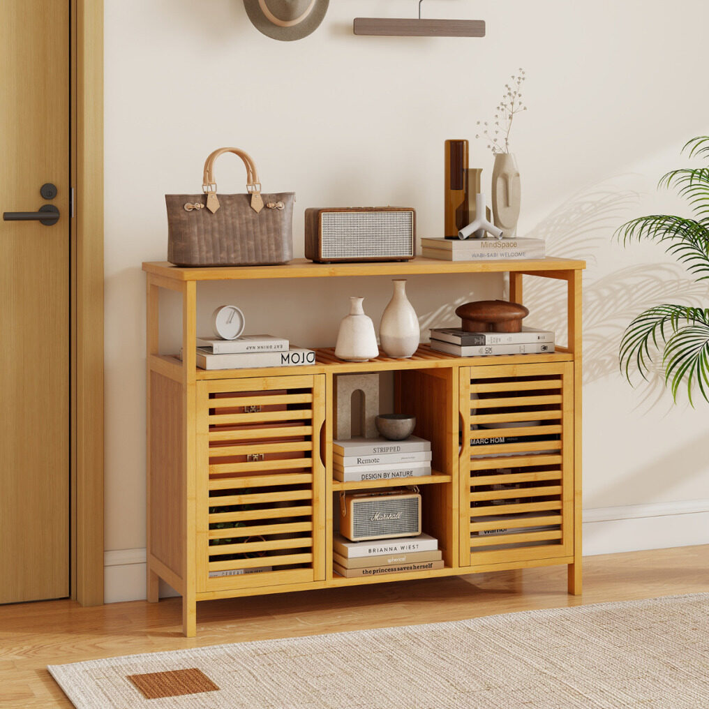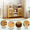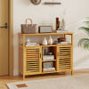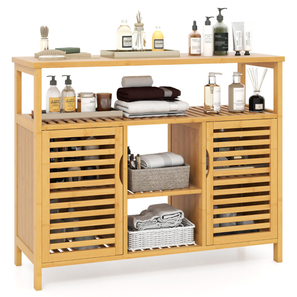 ● Ample Storage Space: The bamboo bathroom cabinet features a spacious top surface, versatile shelving options, and 2 generously-sized enclosed cabinets. Ideal for storing towels, toiletries, and other essentials, it keeps your space tidy and organized.