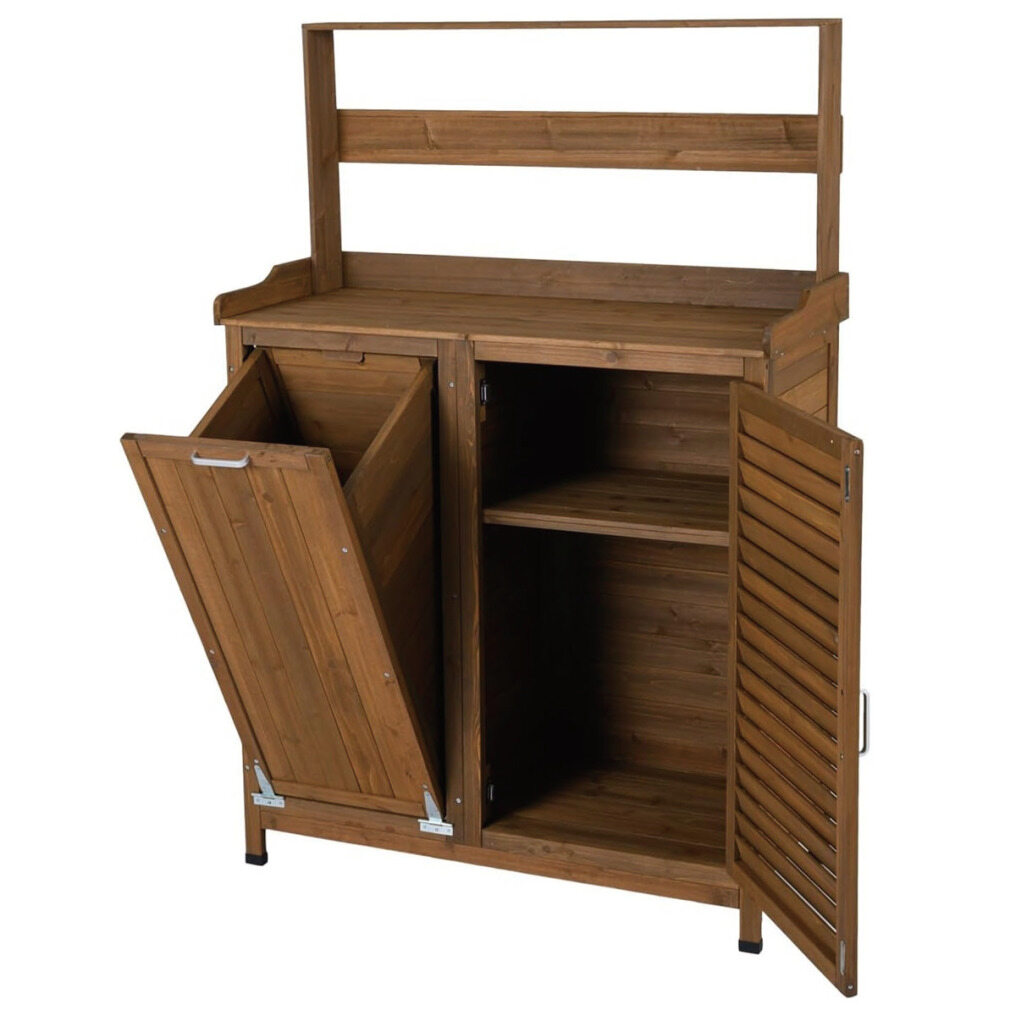 Transform your outdoor space with this sturdy fir wood potting bench, designed for both functionality and rustic beauty. Featuring a spacious work surface, a two-door cabinet, and a lower shelf, this garden furniture piece offers ample storage to keep your gardening essentials organized. Additionally, the three shelves inside the doors are removable for customizable interior space. Whether used as a dedicated gardening workstation or a versatile patio cabinet, this solid wood storage solution will enhance your lawn, backyard, or garden. With its thoughtful details, this wooden cabinet will elevate your outdoor living and gardening activities.