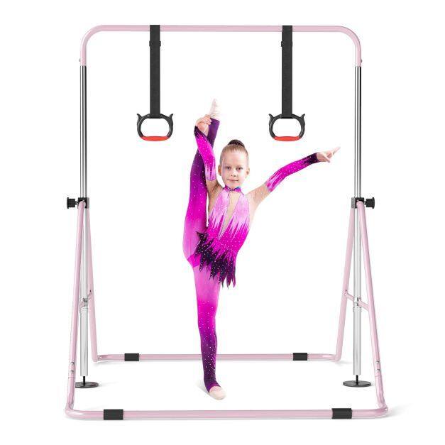 Safe & stable gymnastic bar: This training bar for children consists of a robust metal frame with rounded corners for reliable safety and stability. Non-slip rubber pads and adjustable support legs ensure a firm stand on various surfaces.