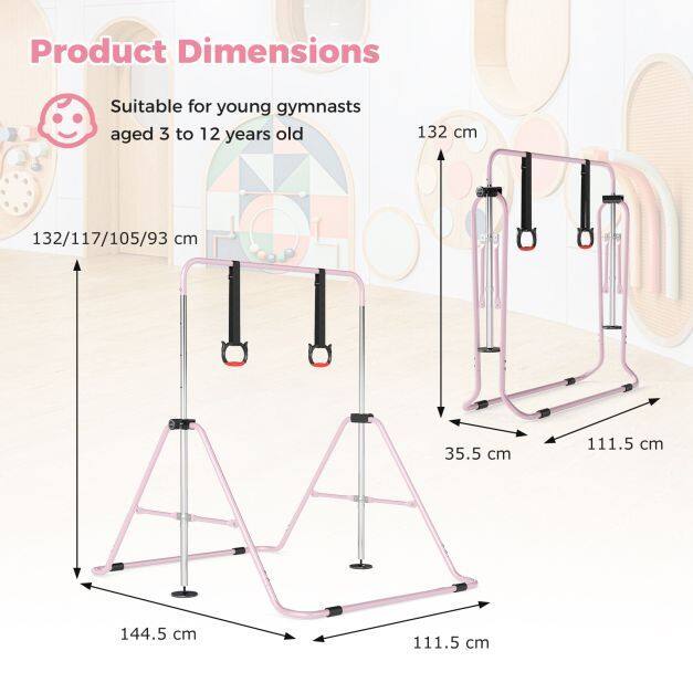 4-way adjustable height: The extendable gymnastics bar offers 4 adjustable heights (93/105/117/132 cm), making it ideal as your little gymnast grows. This feature supports young gymnasts between 3 and 12 years old and adapts to their different developmental stages.