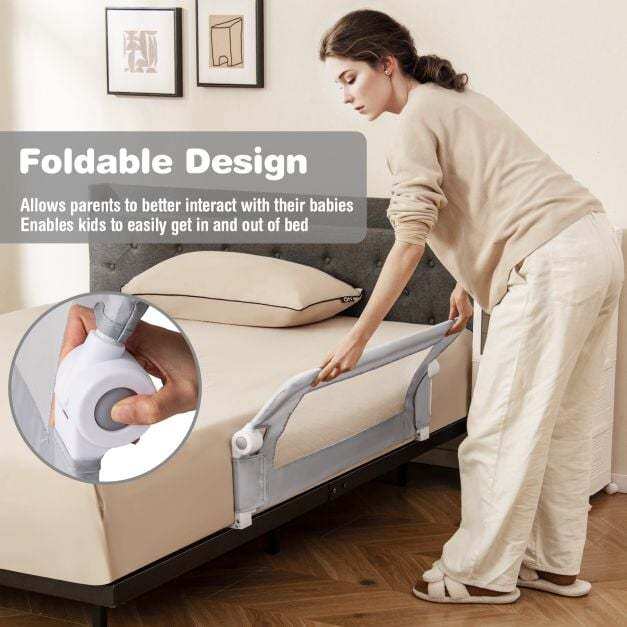 【Foldable Design for Convenience】With the side folding buttons, the kids bed rail can be easily folded down, making it easy for kids to get in and out of bed. In addition, the folded bed rail allows parents to interact more with their children.