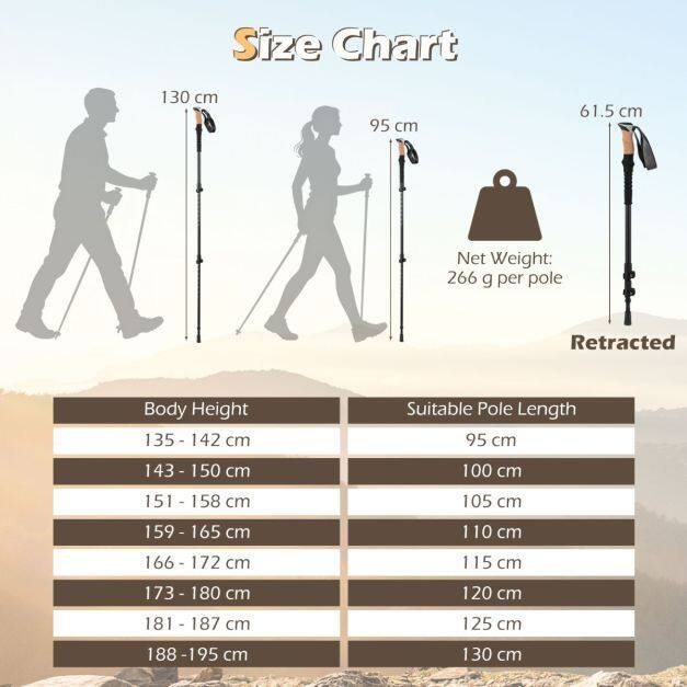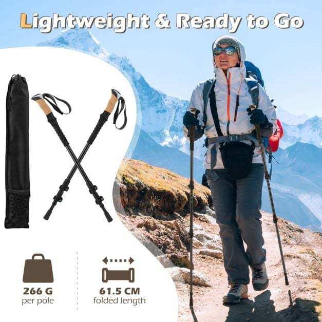 【Lightweight & Ready to Go】Weighing only 266g per pole, these poles are lightweight and very easy to carry. Retractable to 61cm and supplied with a convenient carrying bag, they offer effortless portability, ideal for hiking, mountaineering, or leisurely walks.