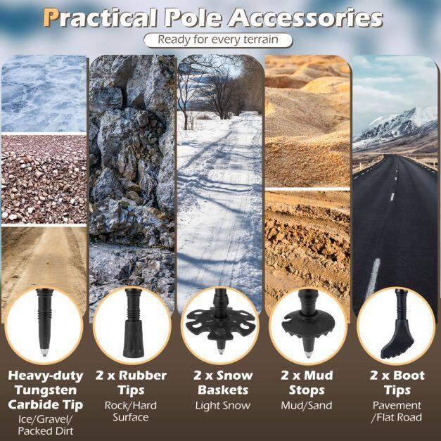 【Ready for All Terrains】Equipped with a robust tungsten carbide tip, these poles offer reliable traction on ice, gravel, and dirt trails. Supplied with 2 snow baskets, 2 mud stops, 2 rubber tips, and 2 boot tips, this set makes a complete gift for outdoor enthusiasts.