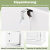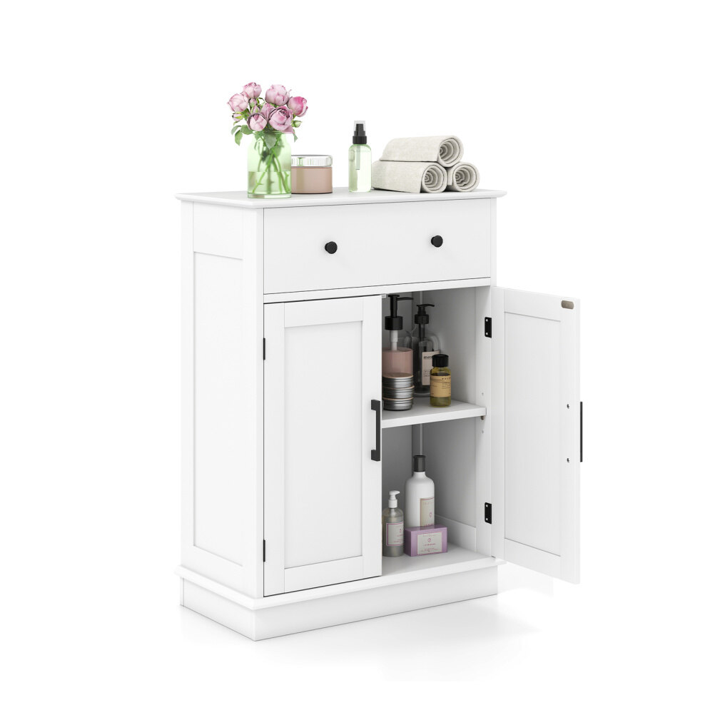 This bathroom storage cabinet offers ample storage with a spacious tabletop, large drawer, and enclosed cabinet. The adjustable shelf allows customization for various items. With an anti-toppling device, this standing cabinet ensures safety and stability. The elegant design, complete with sleek handles, adds sophistication to any room while providing practical storage solutions.