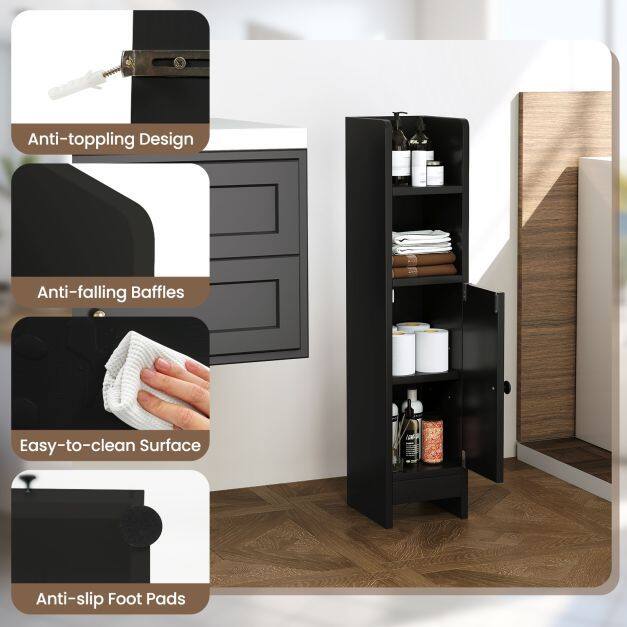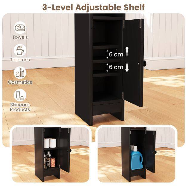 Customized Storage Space: The cabinet of this narrow toilet paper holder includes a removable and adjustable shelf which can be adjusted to 3 heights. This flexible feature fits items of varying sizes.