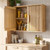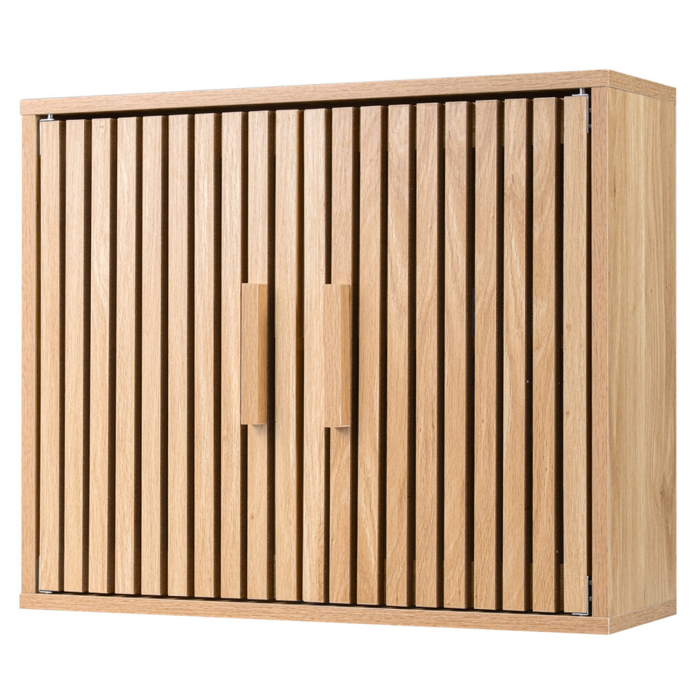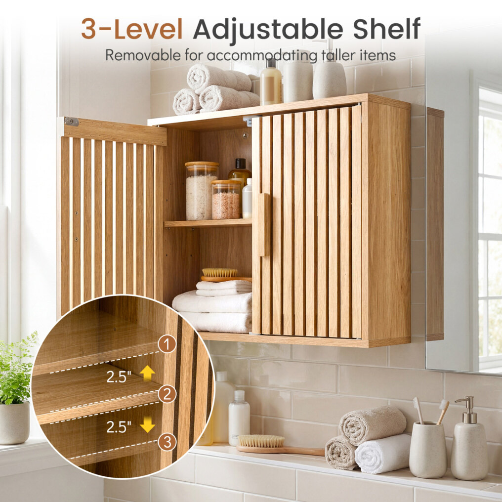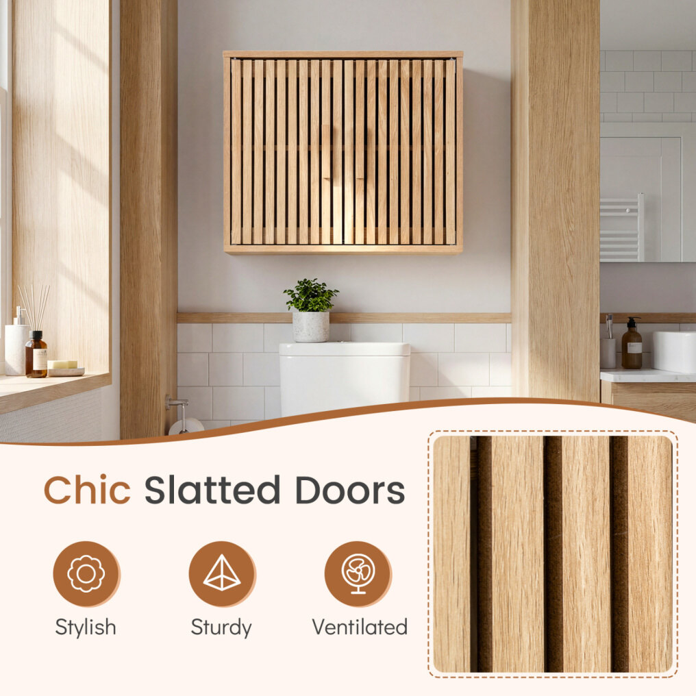 ● Chic Slatted Doors: The slat-style doors stay sturdy and resist deformation, and the ventilation gaps help items stay fresher in bathrooms. Stylish, sleek pull handles add a clean finish, giving the wall cabinet a polished look that pairs well with modern homes.