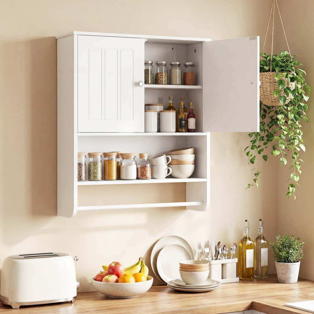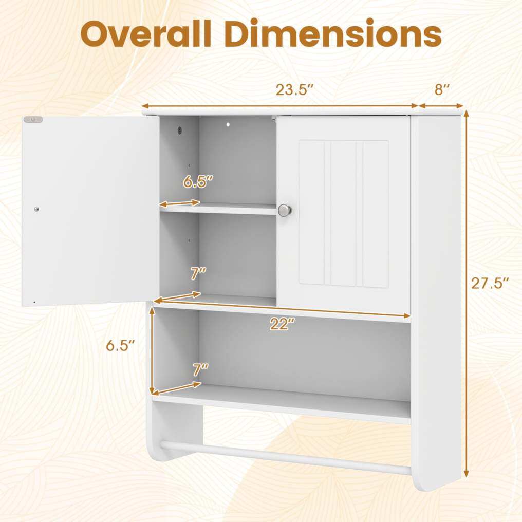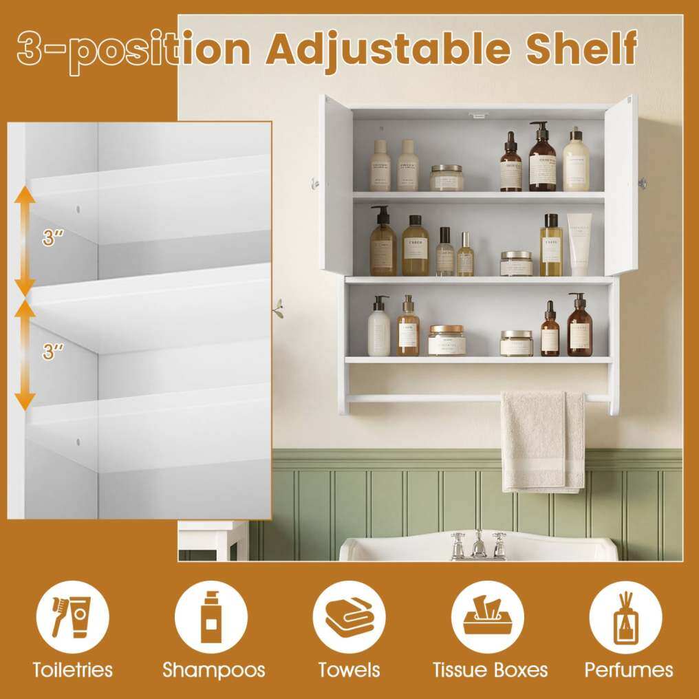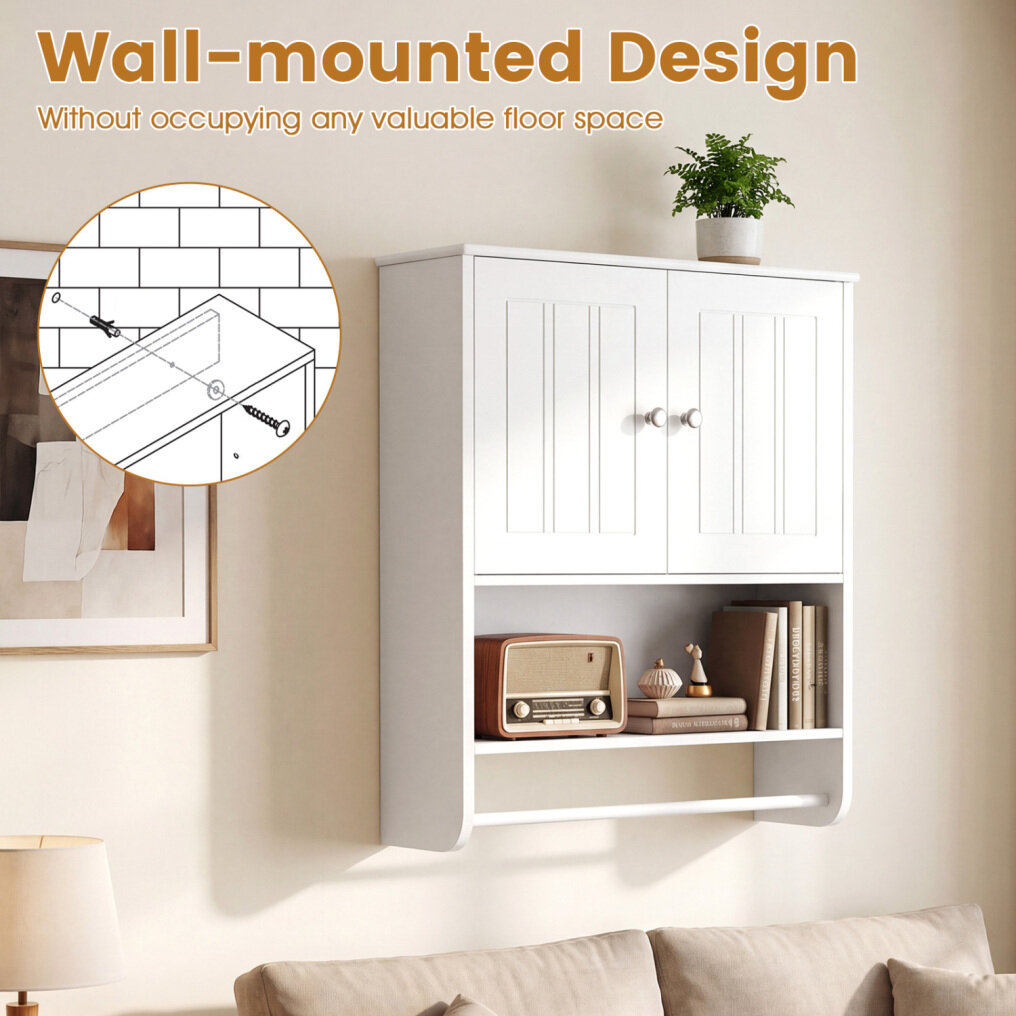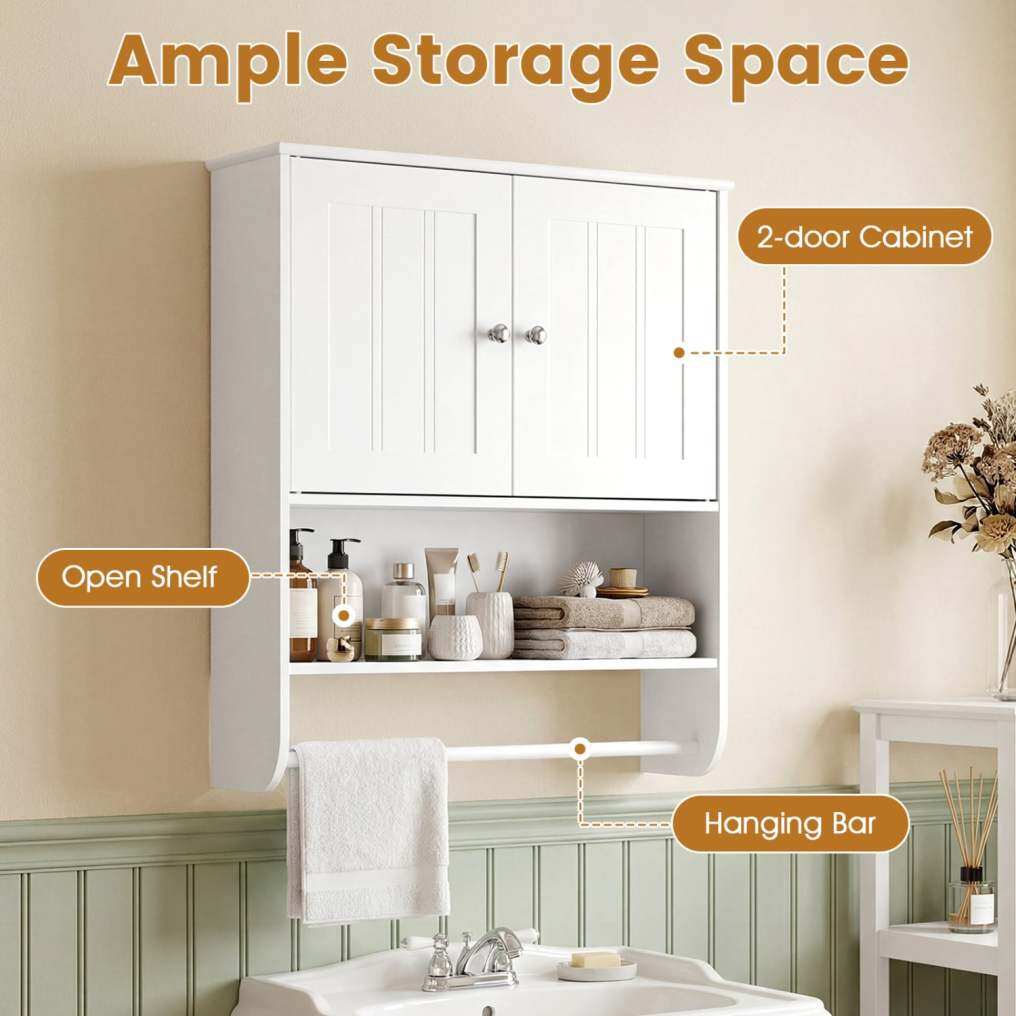 ● Ample Storage Space: This bathroom wall cabinet features a spacious 2-door cabinet and an open shelf, providing versatile storage options for toiletries and essentials. The integrated towel bar adds convenience by keeping towels within easy reach.