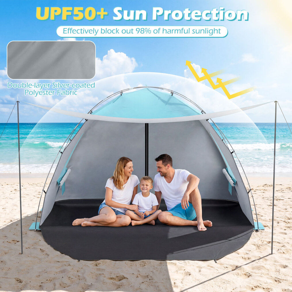 ● UPF50+ Sun Protection: Crafted with premium double-layer silver-coated polyester fabric, this beach tent offers true UPF50+ sun protection that effectively blocks out 98% of harmful rays. It makes hot summer days cool and carefree for the whole family.