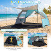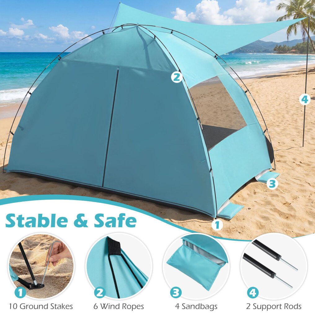 ● Stable & Safe Structure: The beach sun shelter features 8.5 mm thick fiberglass poles, offering enhanced resistance to bending or breaking. Moreover, it includes 10 ground stakes, 6 wind ropes, and 4 sandbags to secure each corner of the tent, engineered for stability.
