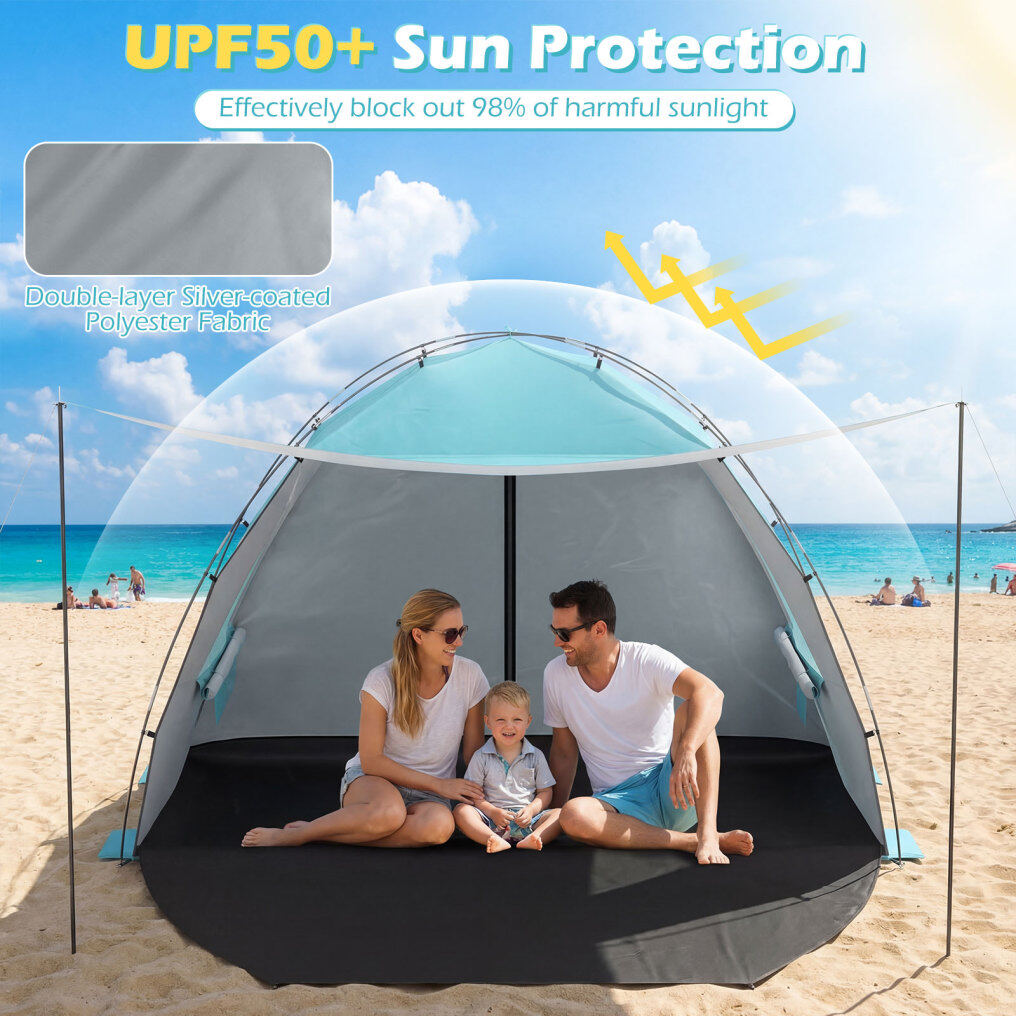 ● UPF50+ Sun Protection: Crafted with premium double-layer silver-coated polyester fabric, this beach tent offers true UPF50+ sun protection that effectively blocks out 98% of harmful rays. It makes hot summer days cool and carefree for the whole family.