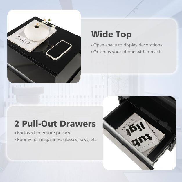 Adequate Storage: The bedside table has a wide tabletop to keep your smartphones within reach. Plus, it features 2 pull-out drawers with metal slides, ensuring a smooth opening. Also, a cable management hole is included to organize wires.