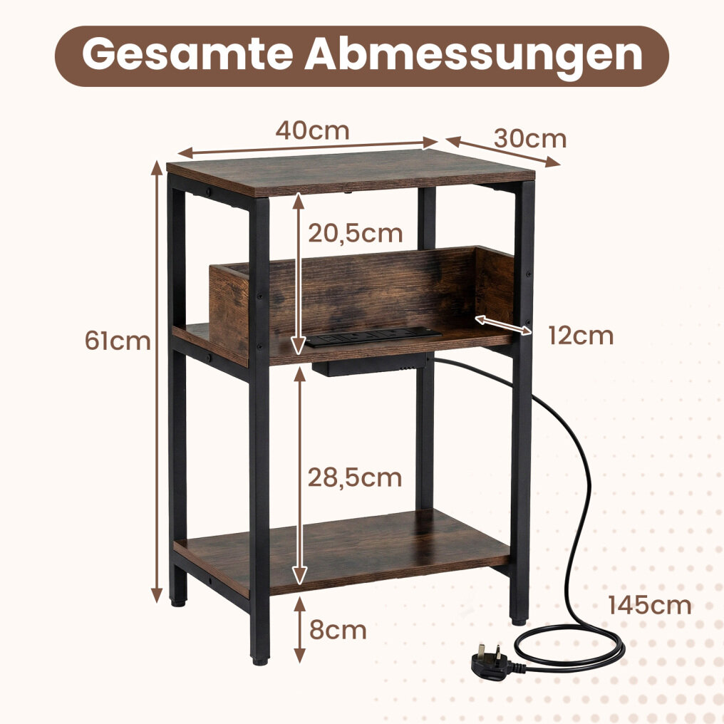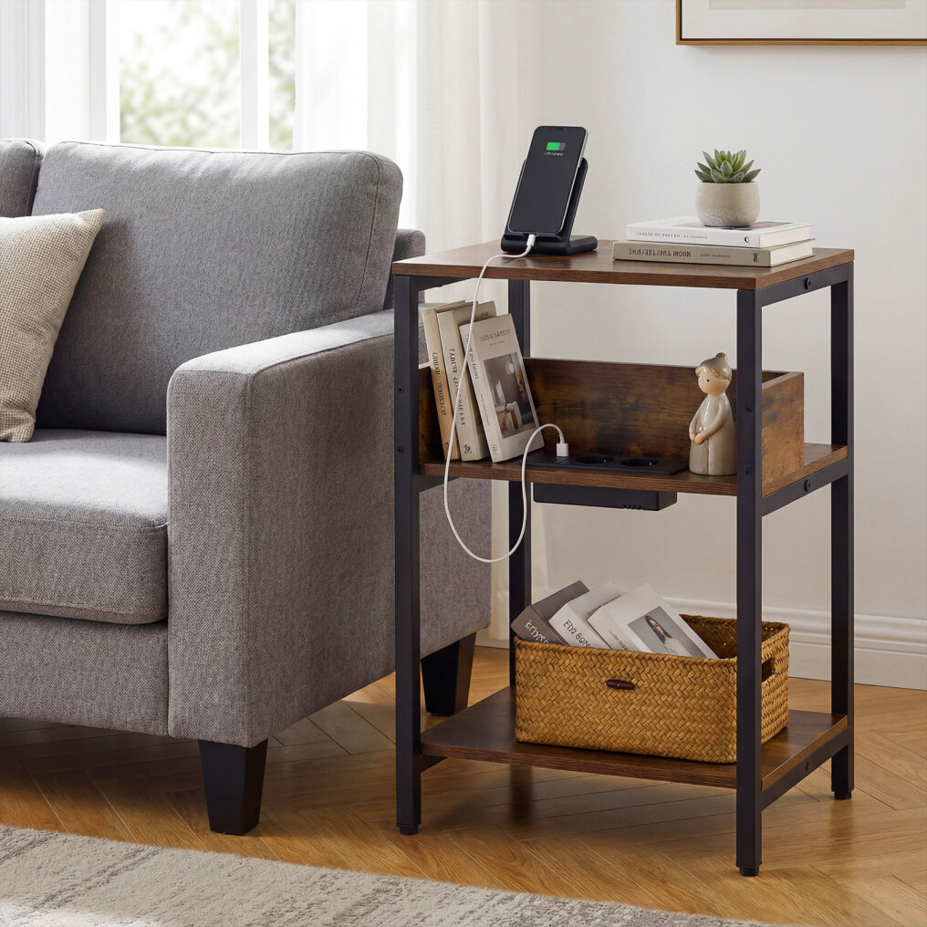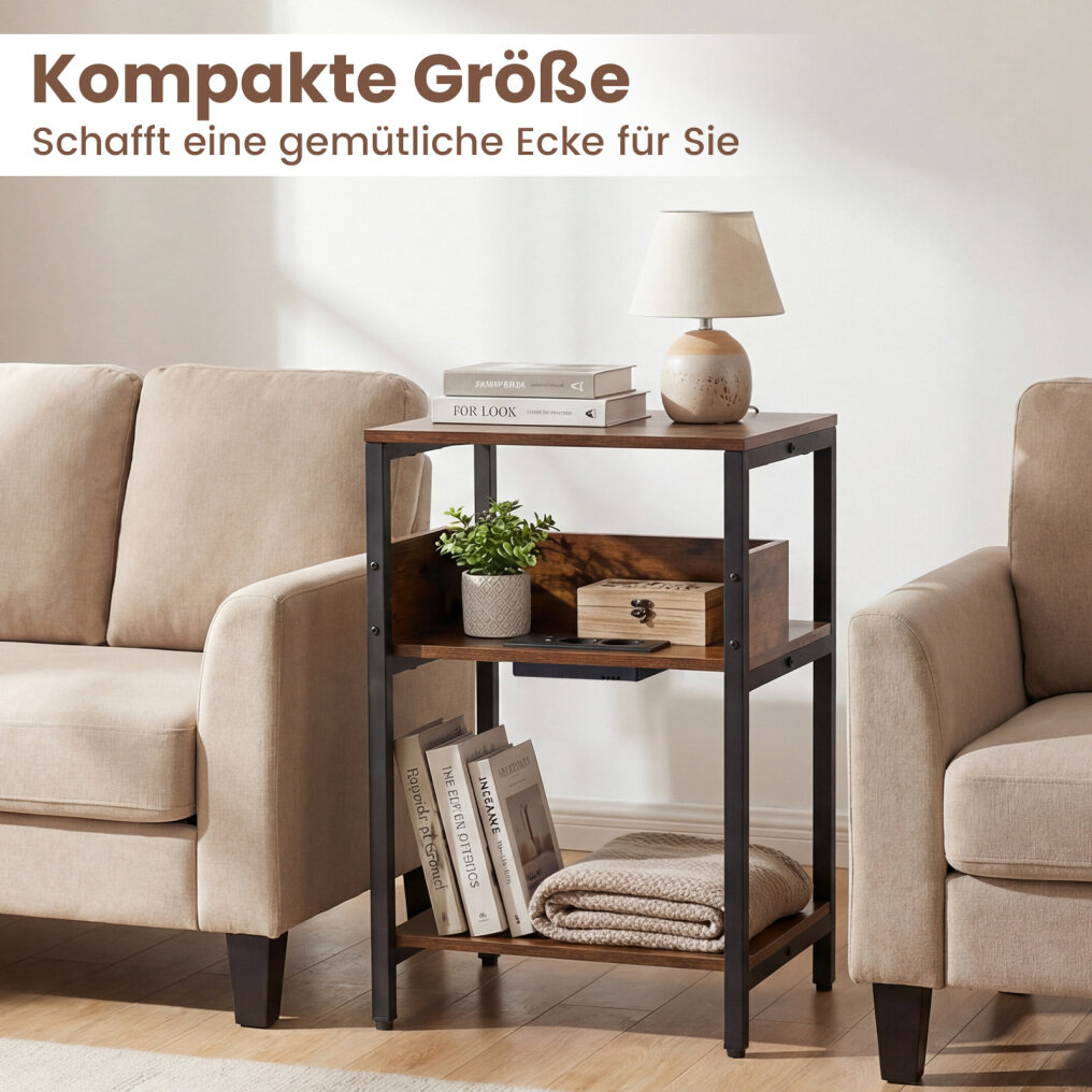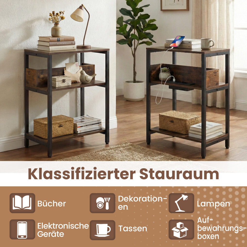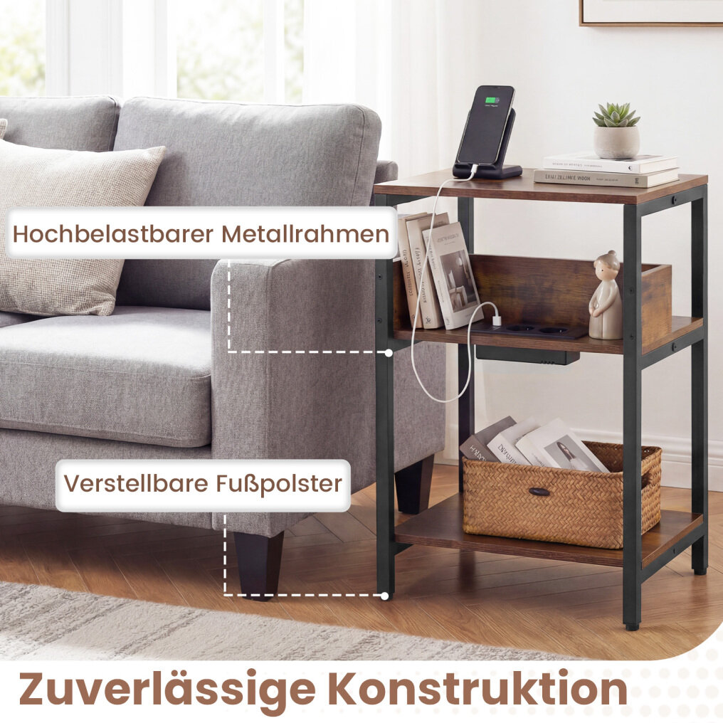 This side table features an integrated charging station, providing convenient power access for your devices next to your bed or sofa. With three open shelves, the nightstand offers ample space to organize books, cups, lamps, storage boxes, or decorative items, keeping essentials within easy reach. The robust construction with a powder-coated metal frame combines stability with durability.