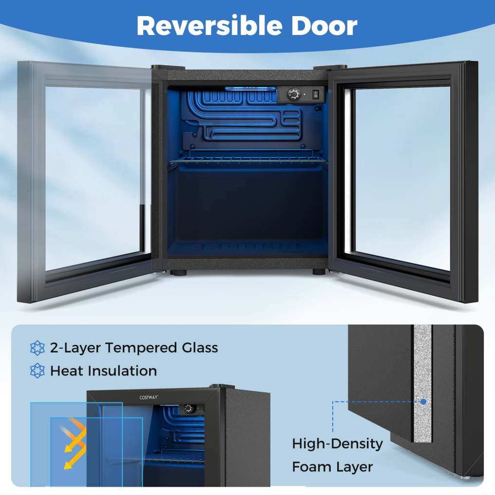 ● Well-Crafted Mini Fridge: This beverage cooler is equipped with a reversible door made of 2-layer tempered glass, combining effective thermal insulation with clear visibility of your drink selection. Additionally, the defrosting function prevents ice buildup, and adjustable foot pads ensure steady positioning on various surfaces.