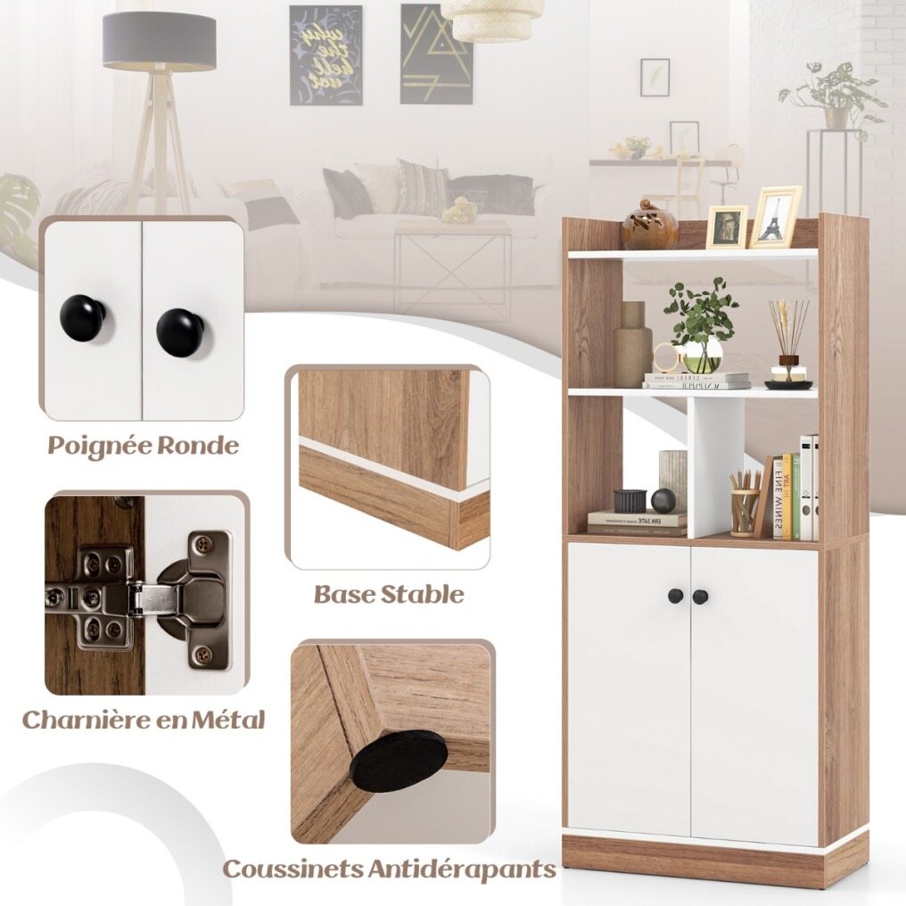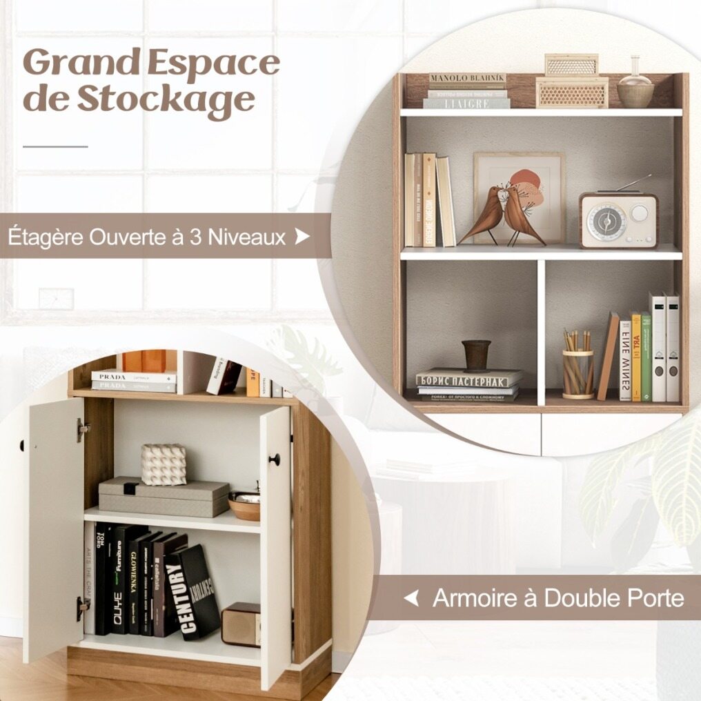A stylish and functional storage solution for your living space! The bookcase features 4 open cubes and a double-door cabinet with a 3-tier shelf that provide ample storage space for displaying and organizing your books, plants or ornaments. Additionally, it is equipped with an anti-tip kit adding extra stability and safety. Whether used in the living room, study, kitchen or office, this freestanding bookcase brings both practicality and aesthetic appeal.