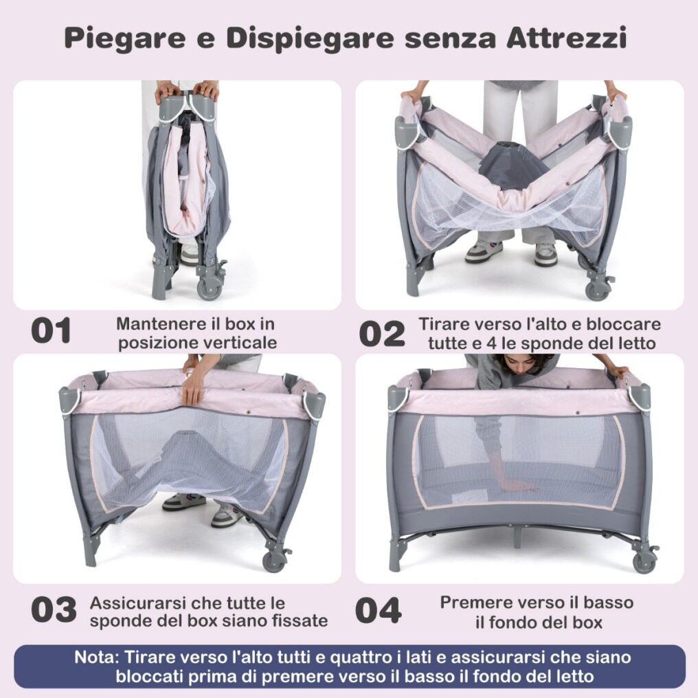 Tool-Free Folding: ① Hold the playpen upright. ② Lift and lock the 4 sides of the crib. ③ Make sure all sides are locked. ④ Press down on the bottom of the playpen. Note: Lift all four sides and make sure they are locked before pressing down on the bottom of the crib.