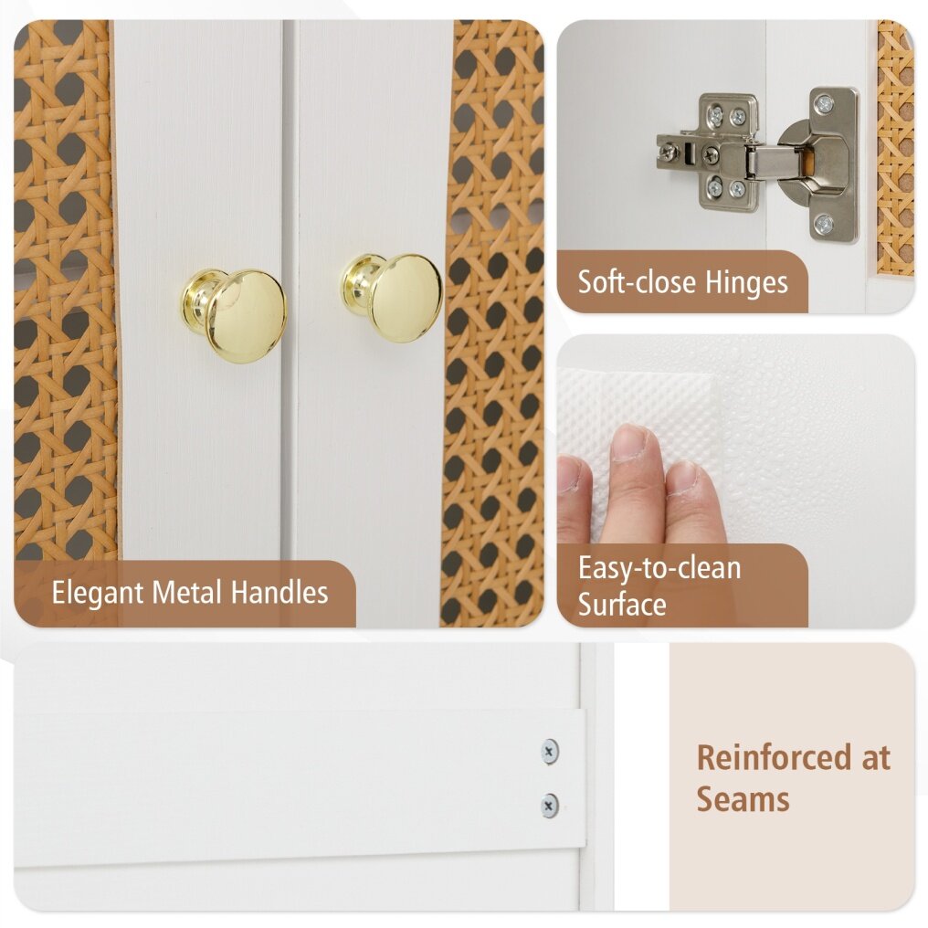 User-friendly Details: The rattan buffet cabinet features elegant metal handles for easy access and a refined touch. Its soft-close hinges ensure smooth, quiet operation, preventing doors from slamming shut.
