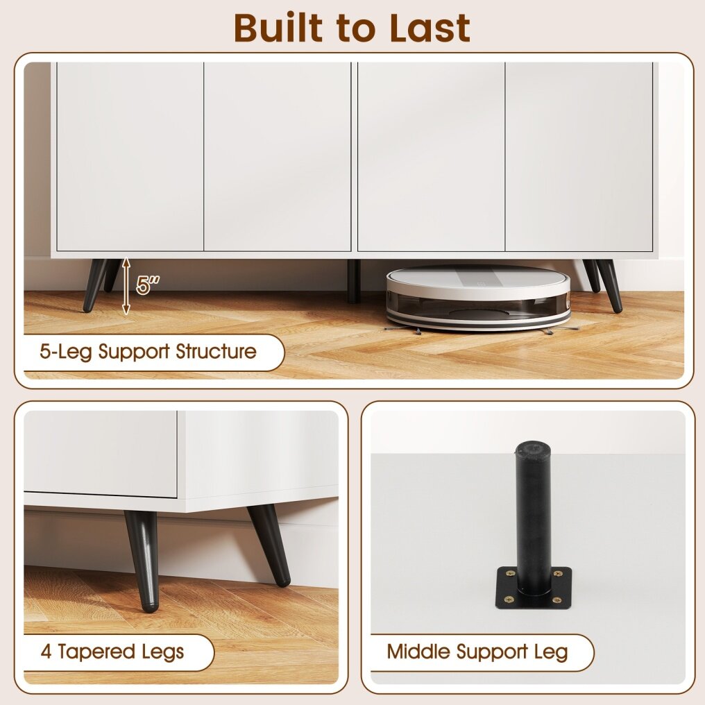 Unlock the secret to a tidy and stylish home with our 4-door buffet sideboard. Elevated for easy cleaning and equipped with sleek, smooth-operating doors, this piece isn’t just furniture—it’s a lifestyle upgrade. With 2 adjustable shelves perfect for everything from linens to dishes, and sturdy support ensuring it stays put, it blends timeless mid-century charm with modern safety features. Ideal for the living room, dining area, or hallway, this standout piece will keep your spaces organized and looking great. Bring home the blend of style, convenience, and peace of mind that every modern household deserves!