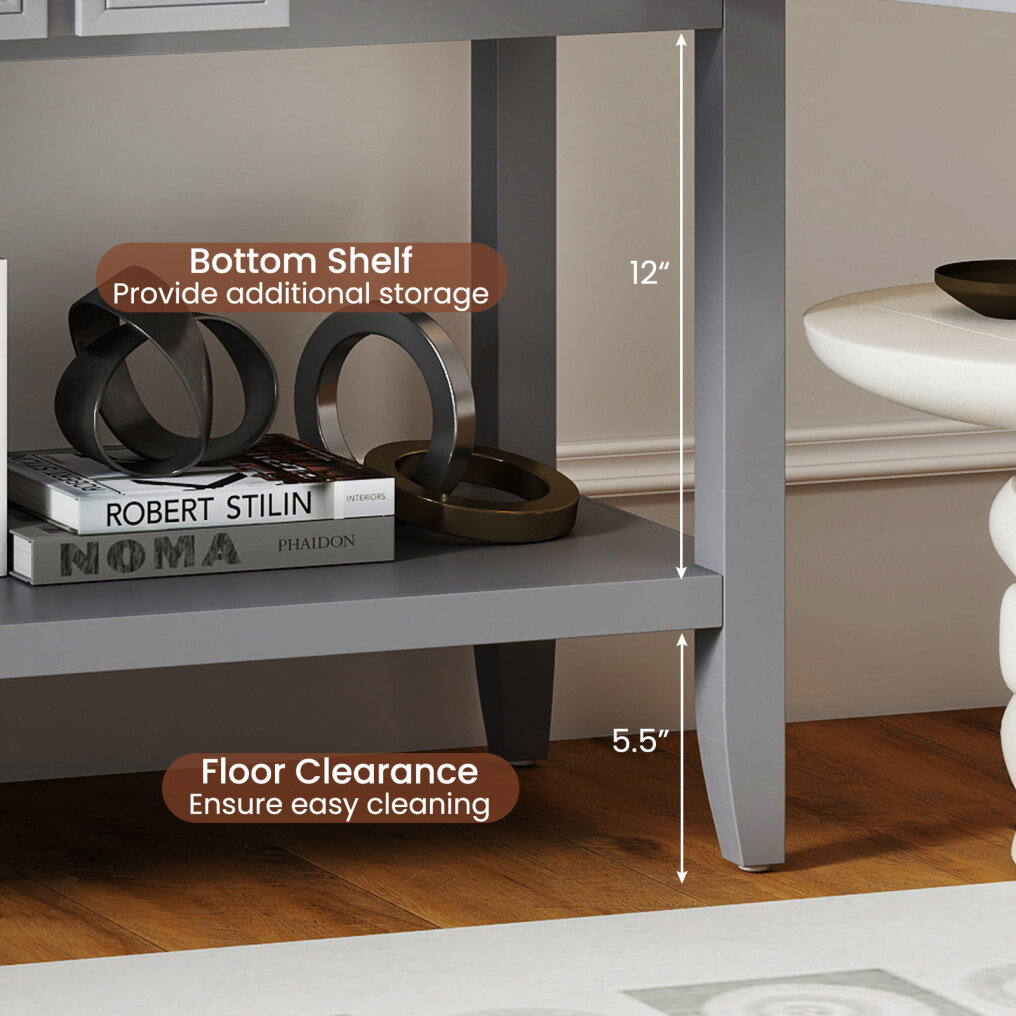● Vintage Appeal: This sofa table with doors combines vintage charm and contemporary efficiency with its clean lines and rustic knobs, adding a touch of timeless elegance to your living area.