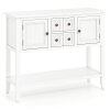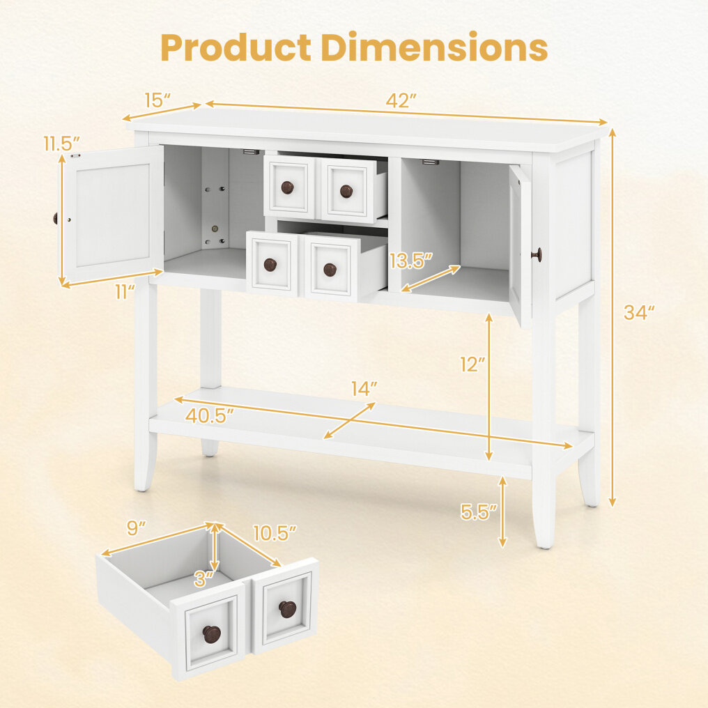Spacious Storage: With a wide countertop, 2 enclosed cabinets, 2 smooth-operating drawers and a bottom shelf, this entryway table keeps various items from dinnerware to baskets effortlessly organized.