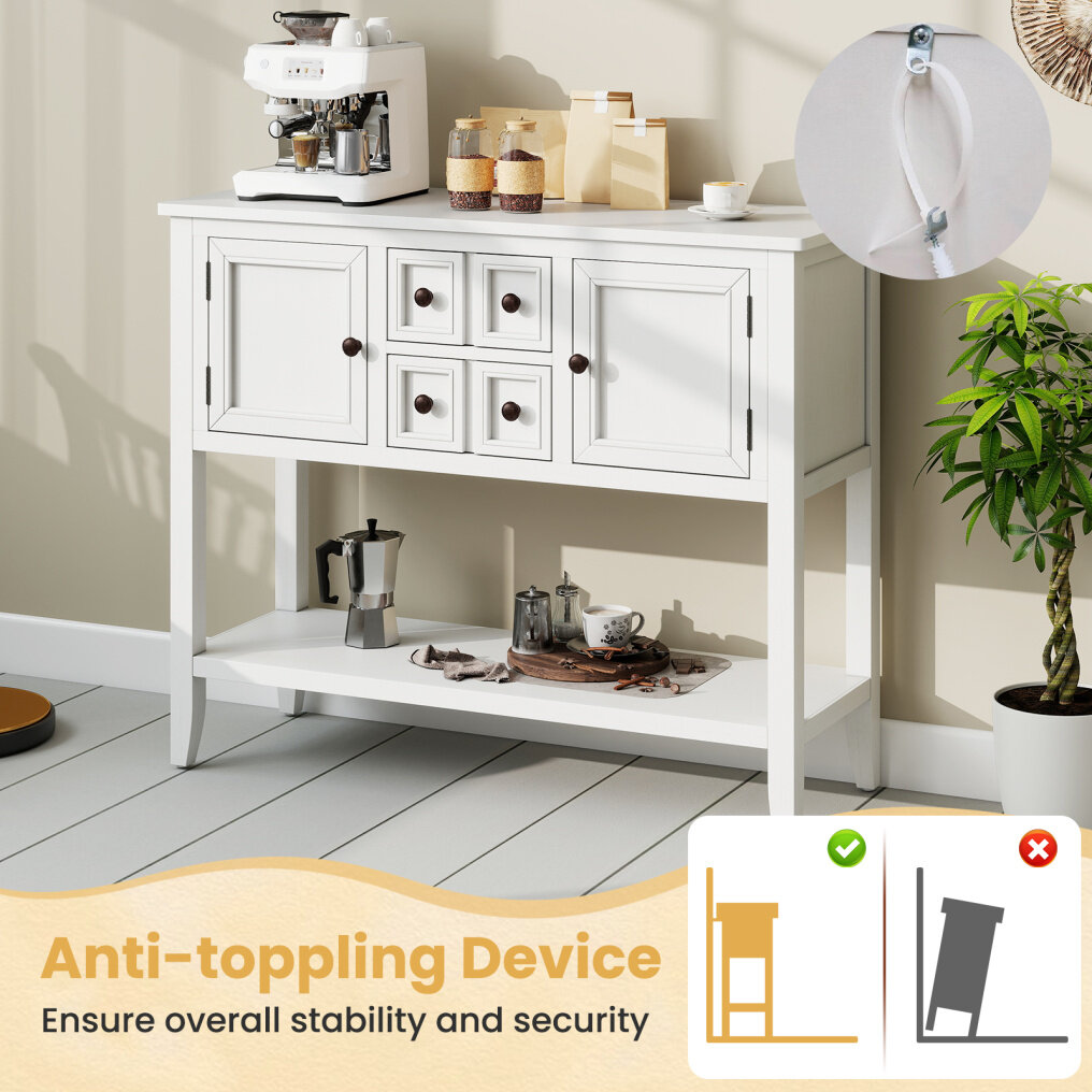 Built to Last: Crafted from solid pine wood and sturdy MDF panels, this sideboard buffet cabinet ensures longevity and robust support for your household items. Plus, the triangular reinforcements and anti-slip foot pads allow for extra stability.
