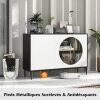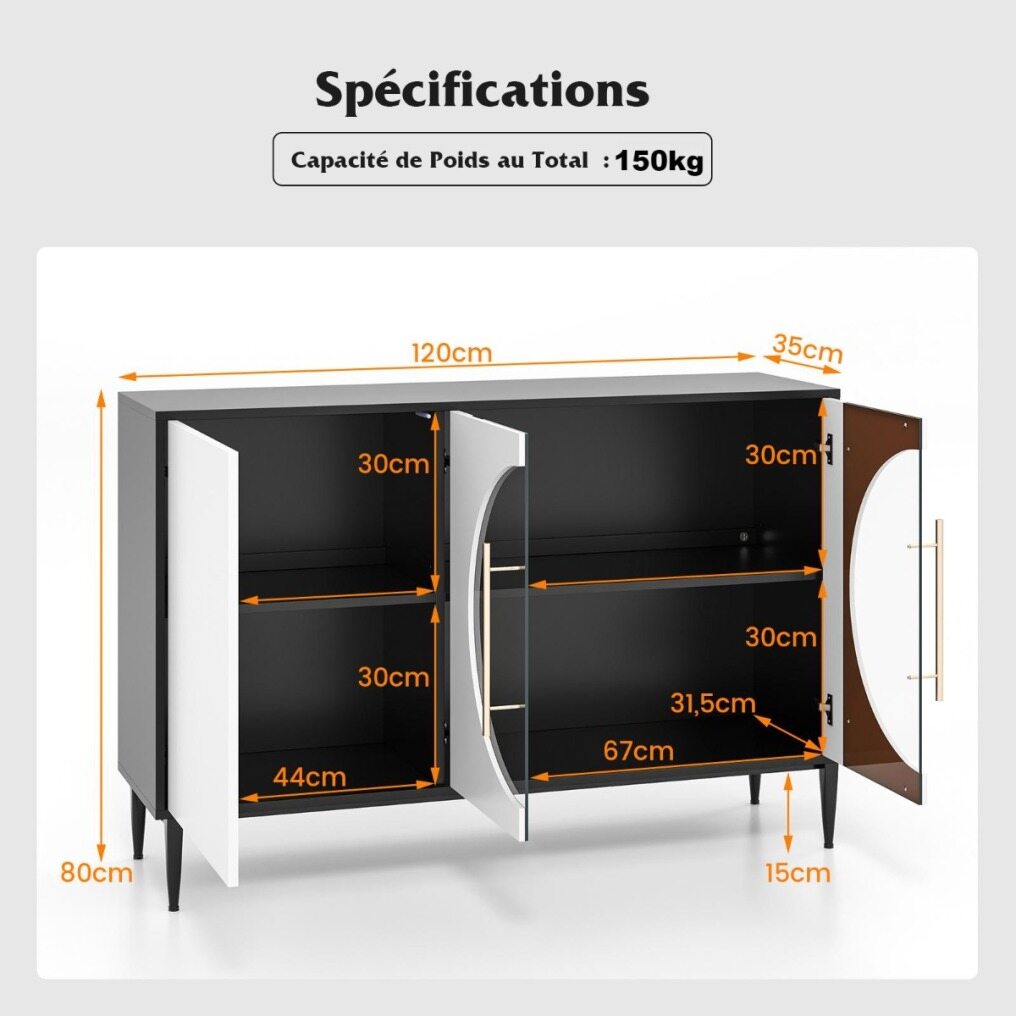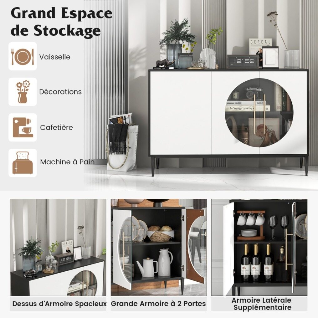 Our modern sideboard is the perfect blend of style and function to brighten up your dining room. Crafted from thick boards, this sideboard is built to withstand everyday use. The high-quality tempered glass cabinet doors add elegance and ensure durability, while the slow-closing metal hinges protect your fingers. Unlike others, our cabinet is equipped with anti-tip devices to ensure the safety of you and your family. The spacious top of the cabinet provides ample storage space for your decorations, glasses, snacks, kitchen appliances and wine. With 2 adjustable shelves, the console table can accommodate different sized items for flexible storage. The raised metal legs not only provide stability but also make it easier to clean the area under the cabinet. This accent cabinet adapts seamlessly to different environments and can be used as a buffet cabinet, living room console or office cabinet.