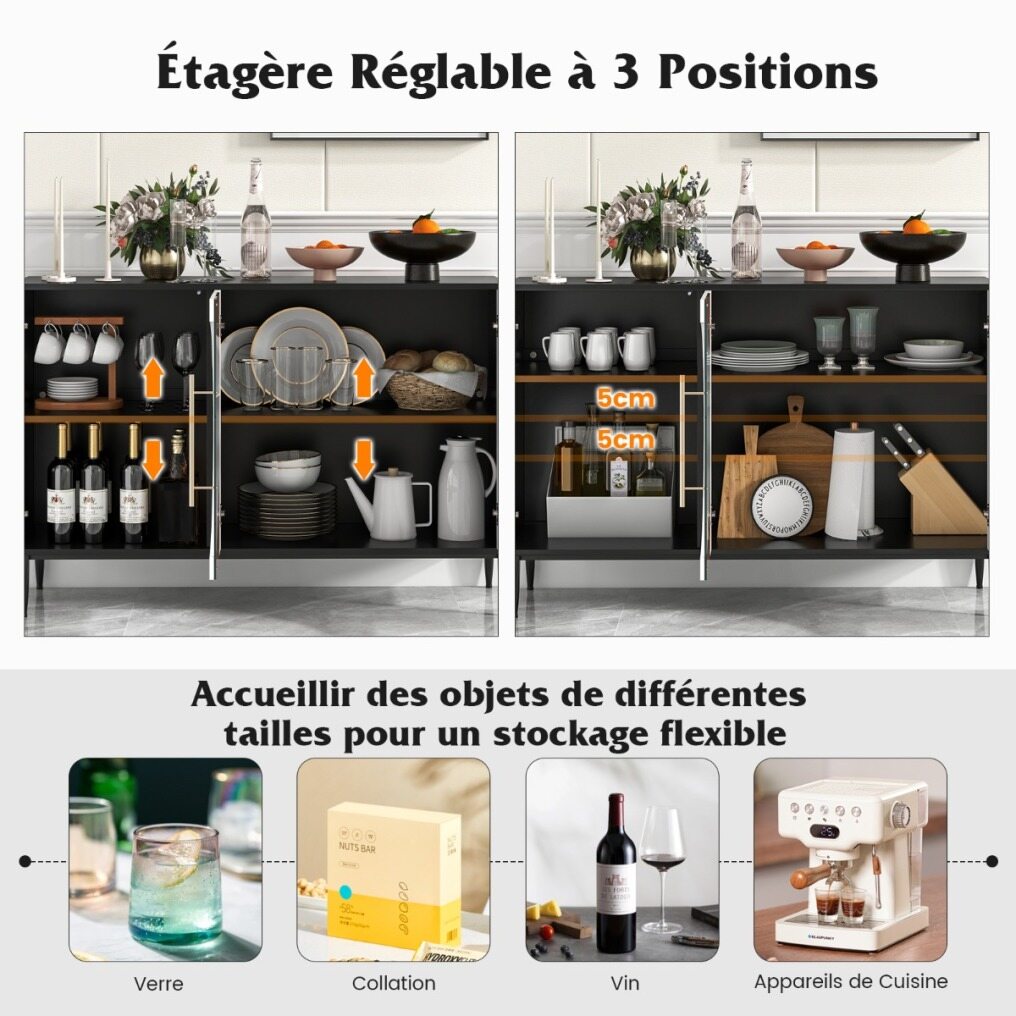3-position adjustable shelf: Our sideboard has 2 adjustable shelves, each of which can be adjusted to 3 positions (5 cm distance between each position). If necessary, the shelves can be removed separately, allowing you to flexibly organize and display your personal items of different sizes.