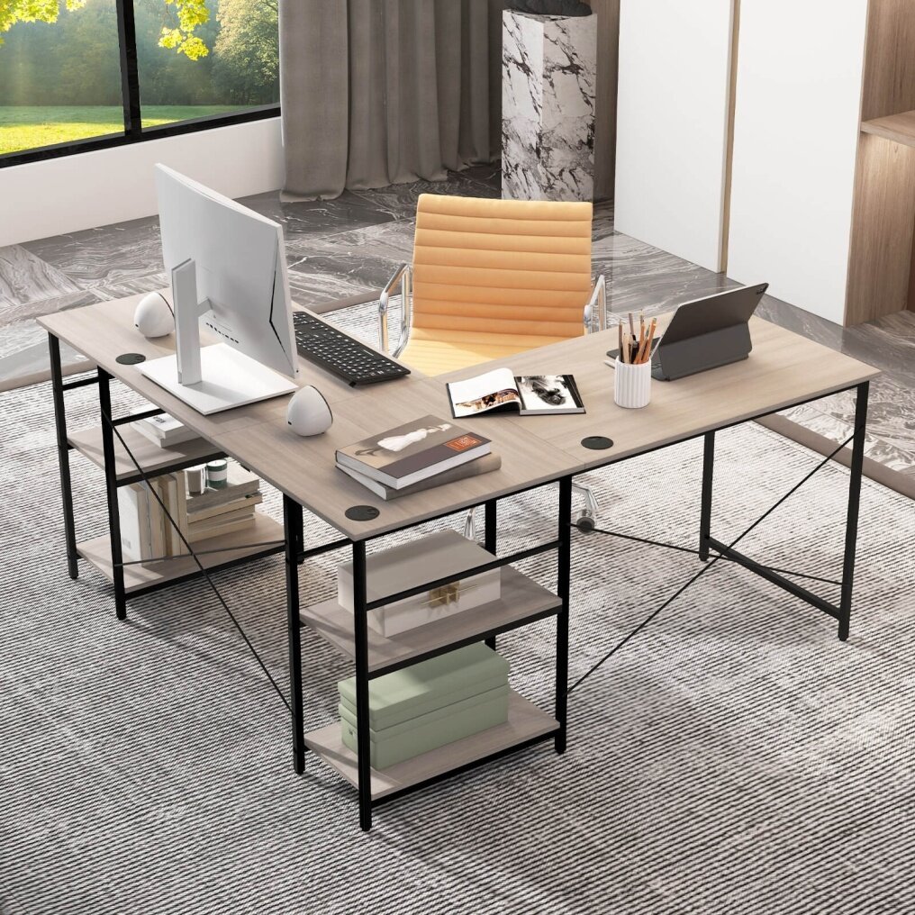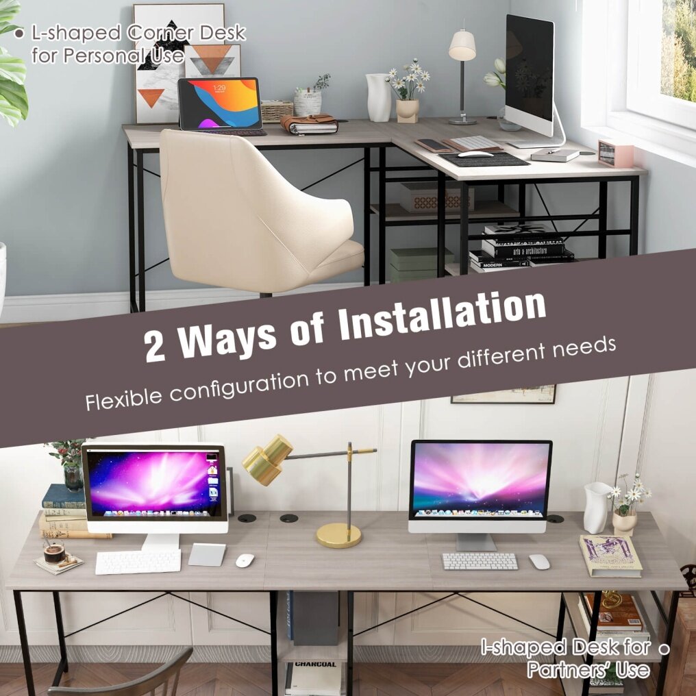 2 Ways to Assemble: The 151cm L-shaped computer desk will be delivered in 2 boxes, and the hardware kit is in Box 1. Start assembly after you have received both boxes. There's an assembly instruction that clearly shows how to install the desk in 2 ways-either an L-shaped desk or a 2-person desk. Choose the form that most fit your space!