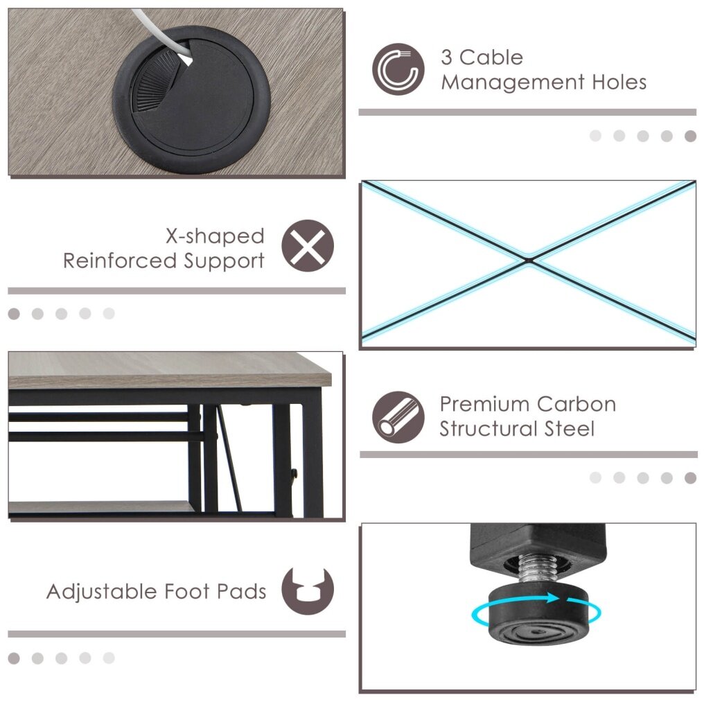 Not only is it an L-shaped desk, but it can also be turned into a long desk, which makes it possible for 2 people to work and study together. Our gaming desk is made of high-quality engineered wood and a heavy-duty metal frame for a stable structure. In addition, the computer desk with a spacious table top can accommodate 2 or more monitors, as well as your game consoles, books or laptops. The desk has 3 built-in cable management holes to help you organize your wires. Moreover, the desk comes with 4 storage shelves. You can adjust the top panel in 2 positions or just remove it to make a CPU stand. Whether used as a PC desk for home, workstation for study, office desk for company or writing desk for a bedroom, this versatile table is a perfect choice!