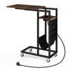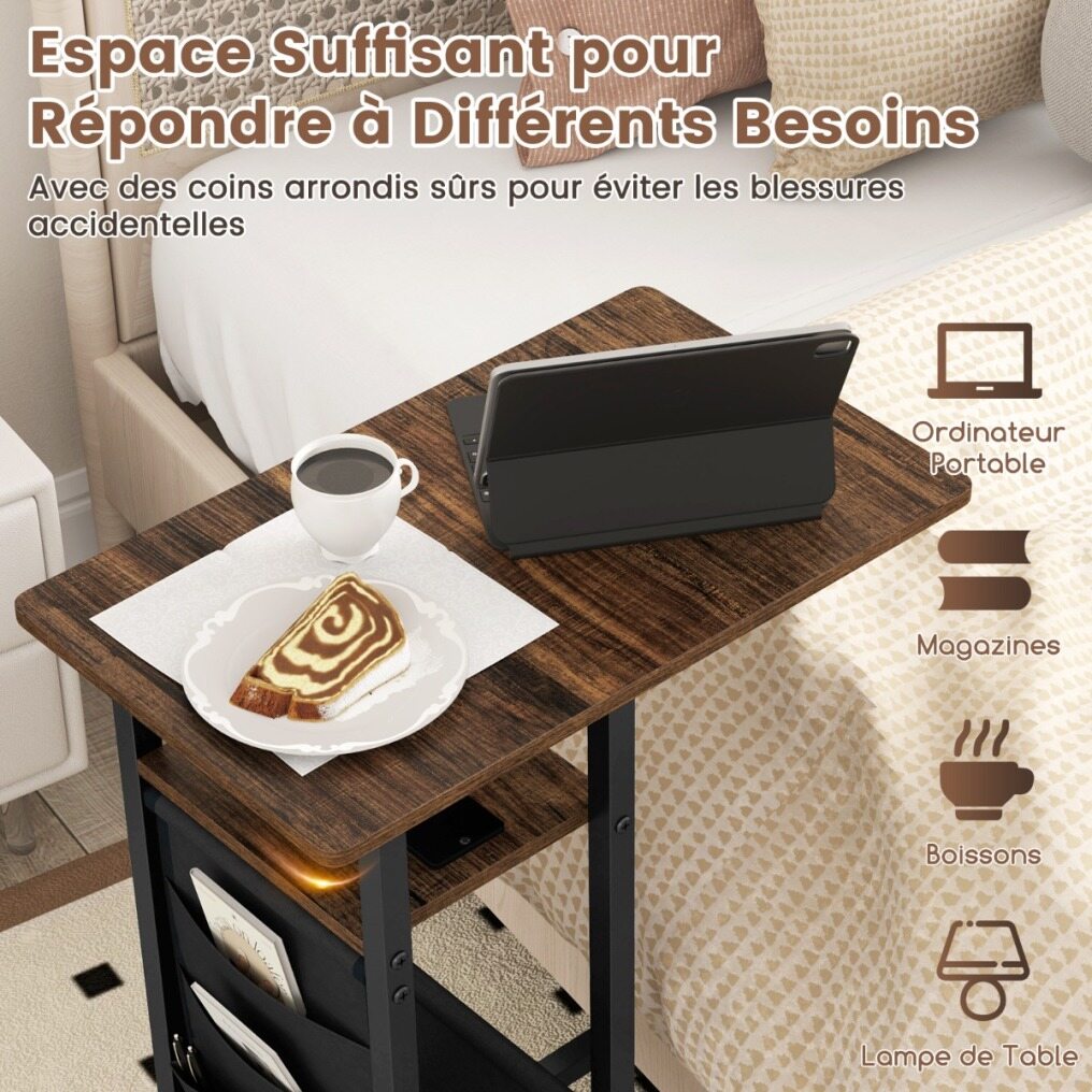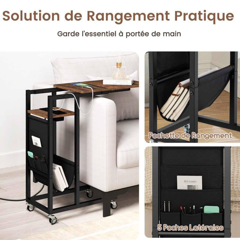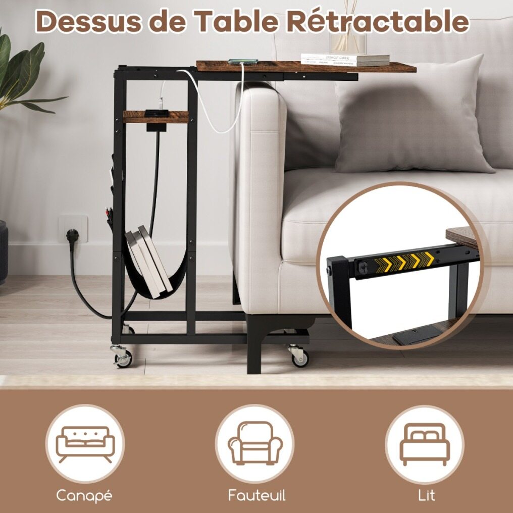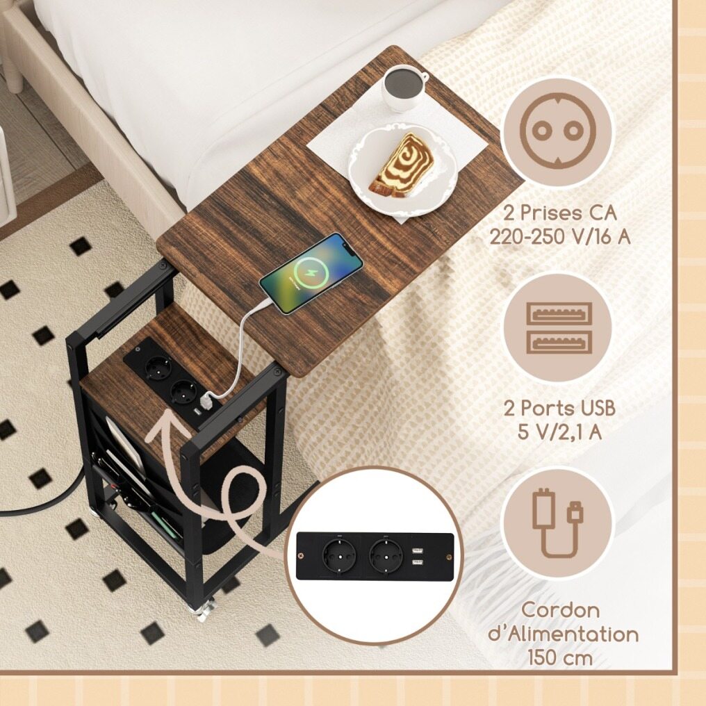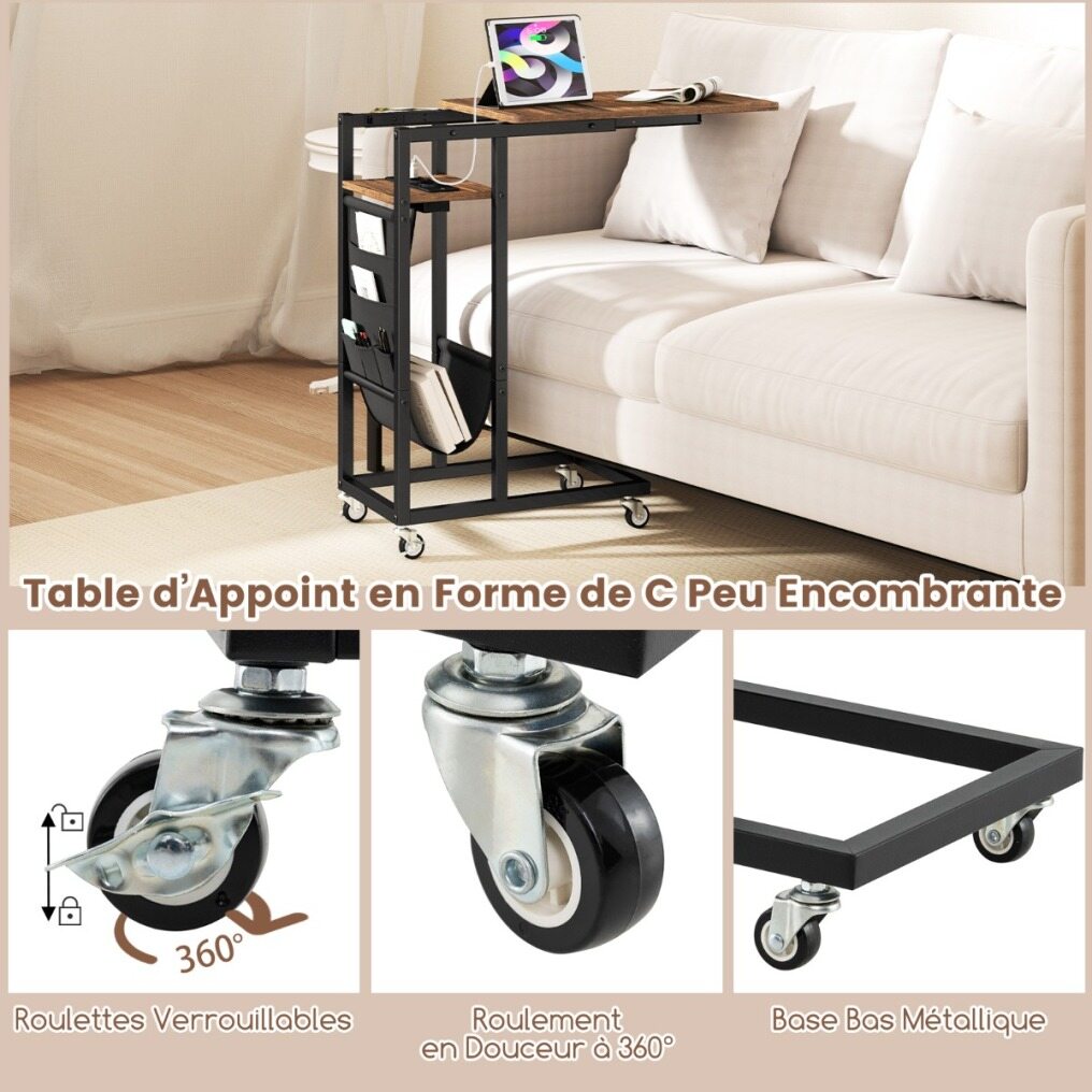 Transform your living space with this chic, ultra-functional C-shaped side table! Perfectly designed to nestle comfortably next to your sofa or bed, this table not only saves valuable space, but enhances your lifestyle with its clever extendable tabletop. No more stretching or bending; everything you need is within reach. Forget about searching for an outlet - your power needs are taken care of right by your side with integrated AC and USB ports. Keep things organized with a sleek side pocket, ideal for your magazines or remote controls. And with 4 universal casters, 2 of which are equipped with brakes, this side table glides elegantly through your space. Sturdy constructed with its sturdy metal frame, it's not just a table - it's an easy-care, long-term companion for your home. Make it yours and increase your comfort and convenience with one clever move!