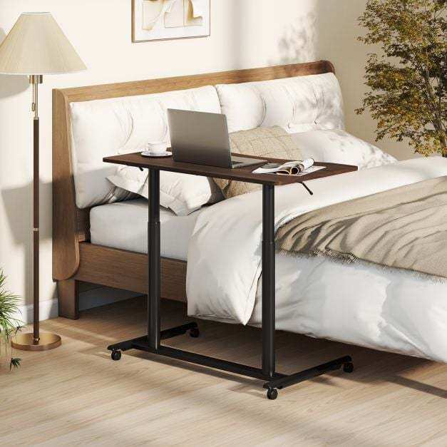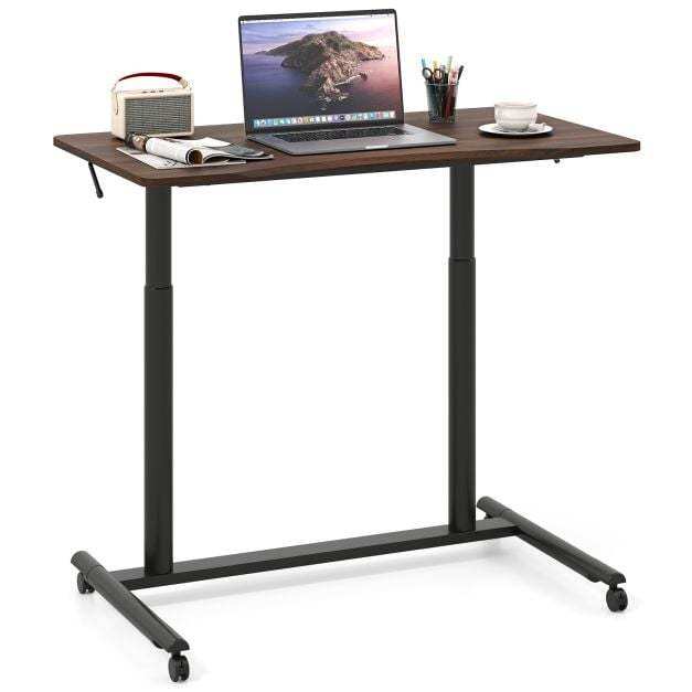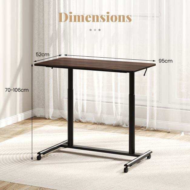 Enjoy the seamless sit-stand work style with the sit stand desk, crafted for easy transitions between sitting and standing with an adjustable height range of 70 to 106 cm. The reliable gas spring ensures smooth height adjustment. Its enduring, robust construction, including aluminum tubes and an H-shaped metal base, can securely hold up to 90 kg. Mobility is effortless with 4 universal wheels, which are lockable as well for secure stopping. The desktop is user-friendly with rounded corners and an anti-crash design, ensuring a spacious and ergonomic workspace. Ideal for any room in your home, the space-efficient C-shaped design maximizes your area, making it perfect for various settings.