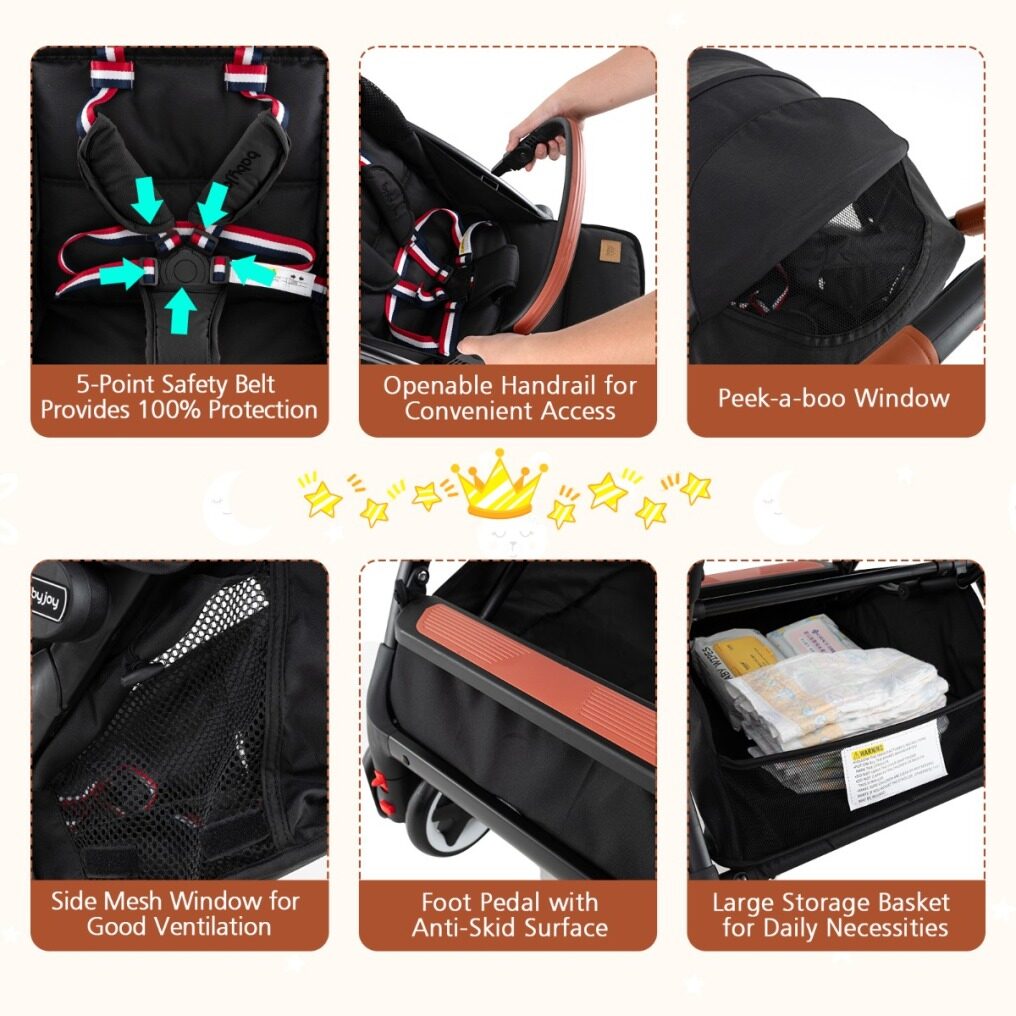 Comprehensive Protection: Our stroller is equipped with a 5-point safety belt, which can gently but firmly fix your baby on the seat. There is a foot brake between the rear wheels, and you can stop the stroller easily when necessary. More importantly, our stroller is made of safe and odourless fabric, providing a healthy environment for your baby.