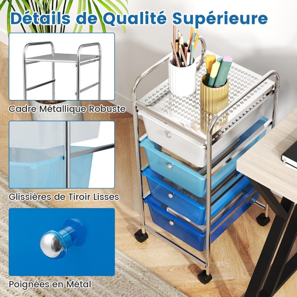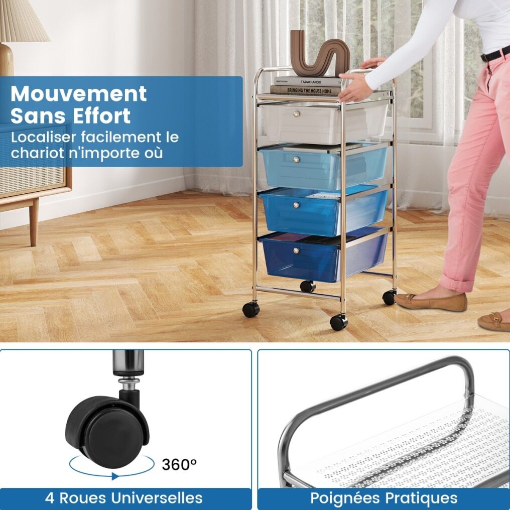 Large Storage Capacity: Equipped with 4 wide and deep drawers, our mobile storage cart is perfect for storing and sorting various items. In addition, the drawers are removable so you can easily detach them for cleaning or rearranging items. In addition, the large top of our storage cart is ideal for displaying some ornaments.