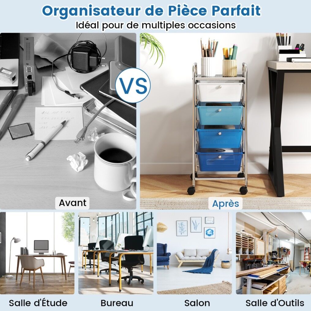 Easy Assembly and Maintenance: For your convenience, the 4-drawer mobile organizer comes with detailed instructions that will help you quickly assemble all the parts. In addition, the drawers are made of waterproof material, so you can easily maintain the shine of our versatile drawer cart over time.