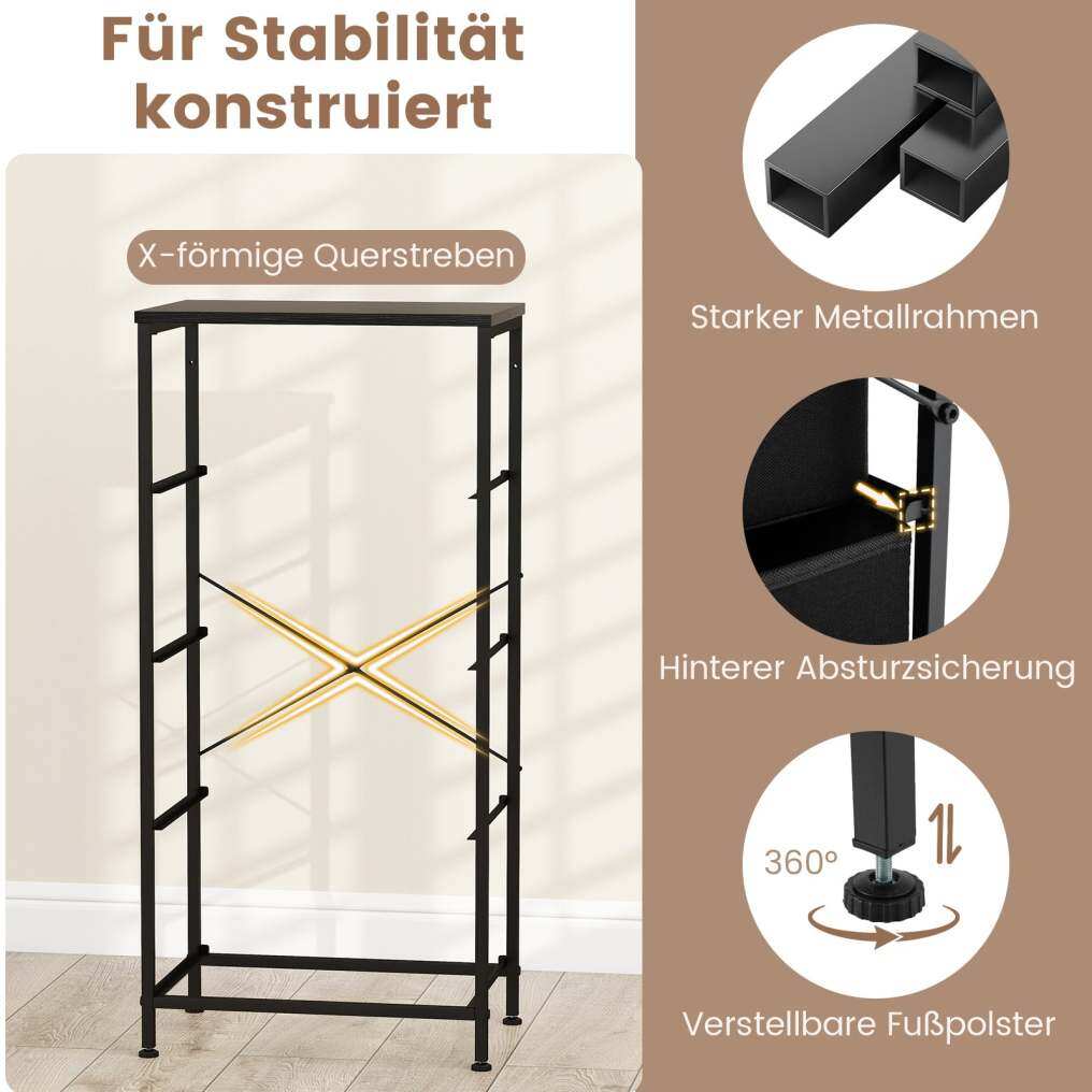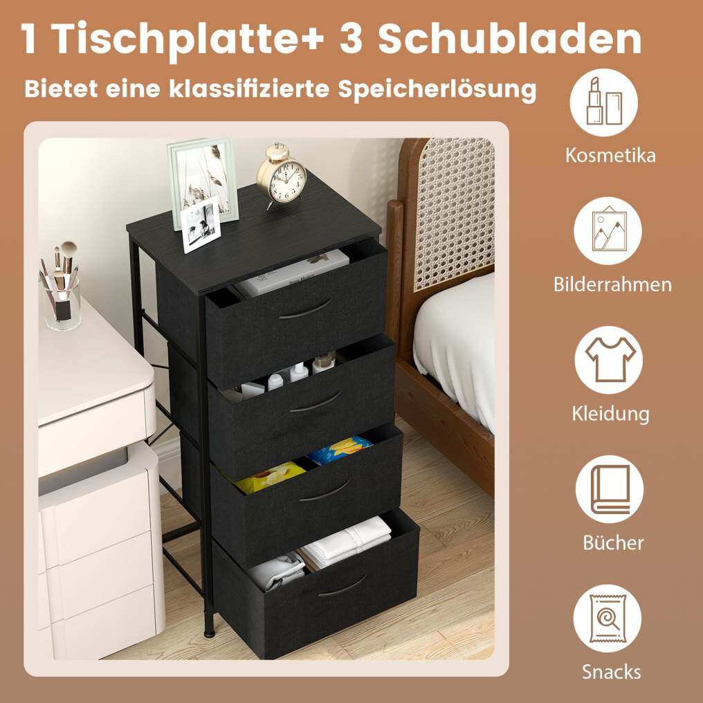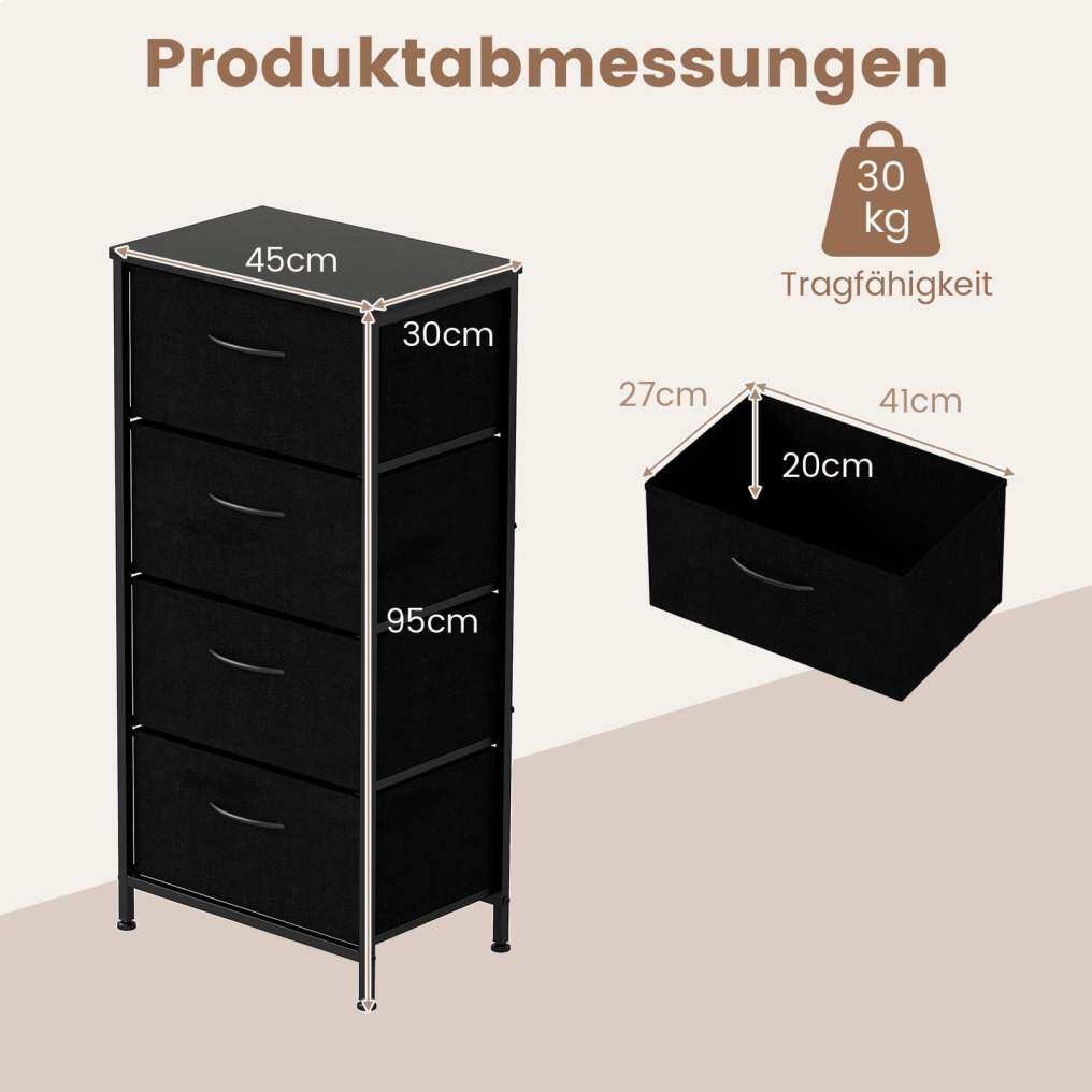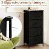 Keep your space stylishly organized with our 4-drawer chest! Featuring a wooden top and four spacious drawers, this fabric storage tower offers a stylish and functional solution for displaying and organizing your belongings. Each drawer has a 3-layer construction for long-lasting use and is easily removable and foldable. Anti-slip stoppers on the back provide added safety, while two anti-tip brackets securely anchor the chest to the wall. Supported by a sturdy metal frame, this bedroom chest offers excellent stability and features adjustable feet. The rustic charm of this nightstand chest makes it a timeless addition to your home – whether in the hallway, living room, or bedroom.