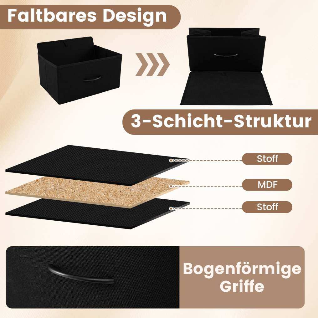Foldable fabric drawers: Each drawer of this chest of drawers consists of a 3-layer structure made of fabric, MDF board, and fabric. The drawers are removable and foldable, with an arched handle for easy handling.
