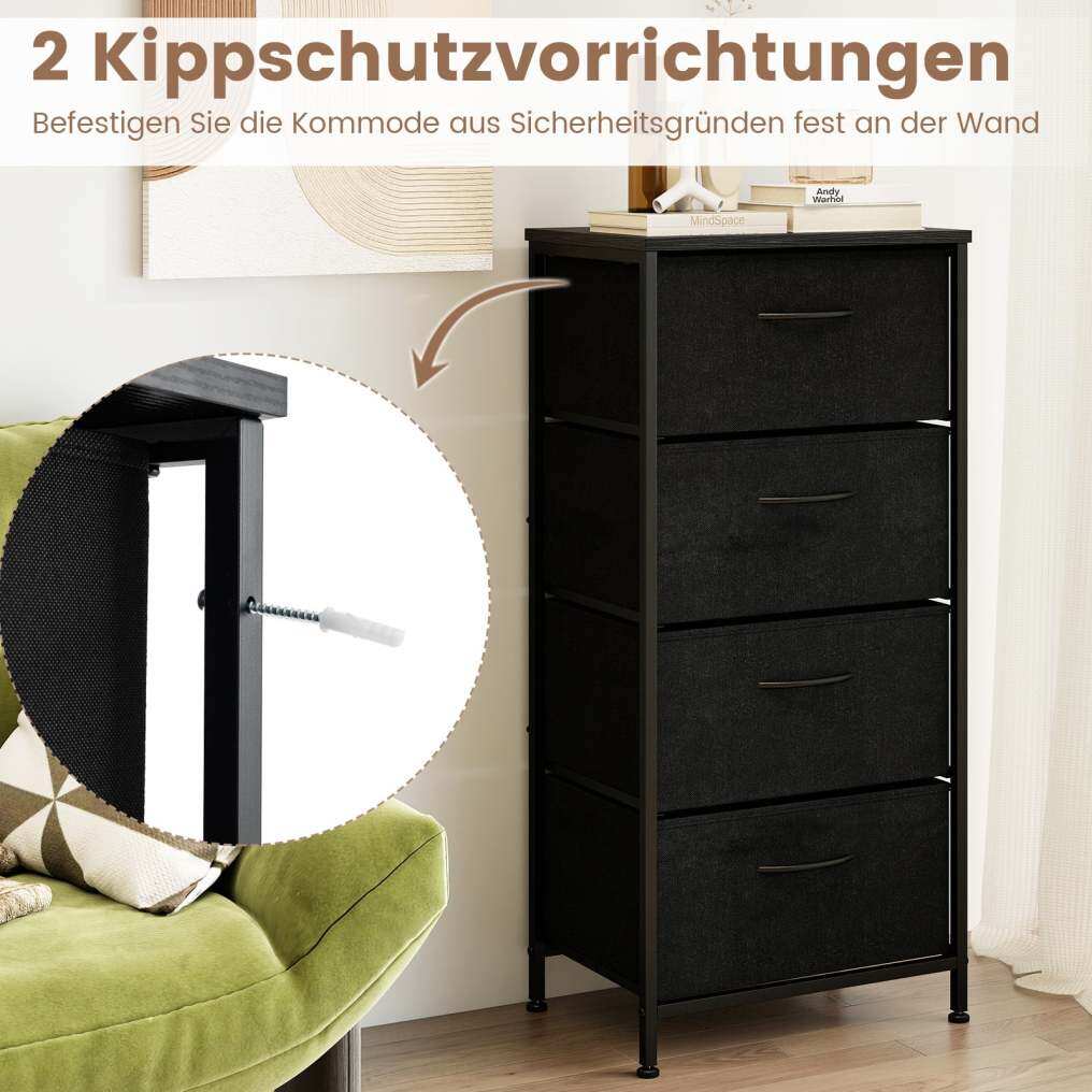 Improved safety features: Equipped with two anti-tip devices, the 4-drawer chest of drawers can be securely attached to the wall. Anti-slip stoppers at the back prevent the drawers from falling out.