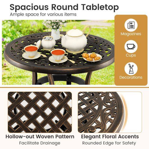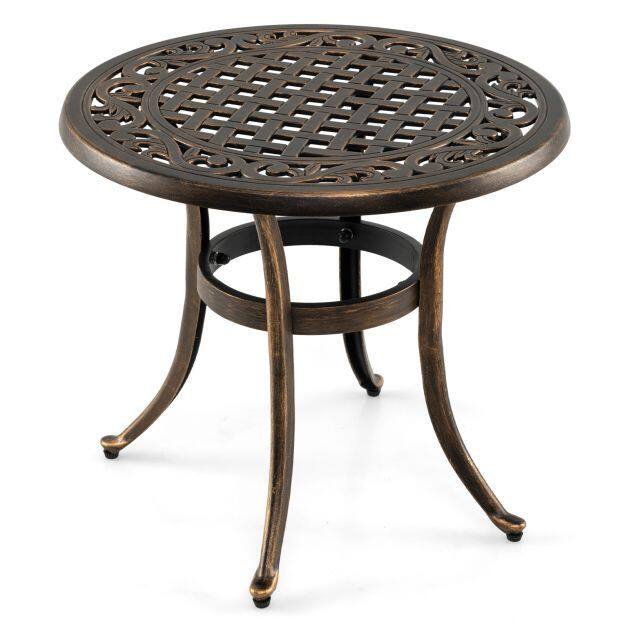 Designed to endure through all seasons, its anti-rust material boasts minimal upkeep and lasting beauty. Offering a generous round surface, it’s the ideal spot for your morning coffee or evening reads. The 4 artistically curved legs provide rock-solid stability, ensuring your leisure time remains uninterrupted. Adorned with a classic woven and floral pattern, this end table adds a touch of elegance and sophistication to any space. Whether you place it on your patio for sunset cocktails or use it in your living room for showcasing your favorite vase, its seamless blend of functionality and chic design will capture the eyes of every guest. Add this eternal piece to your collection and elevate your living space instantly!
