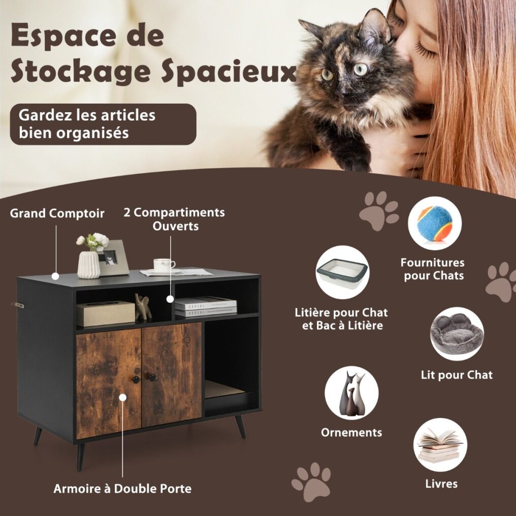Spacious Storage Space: The hidden cat litter box enclosure is designed with 2 open compartments to place cat supplies, cat litter, or daily necessities. And there exists a large countertop for putting some decorations or a cat bed. Besides, the interior measures 21" x 19" x 15" (L x W x H), which is suitable for most cat litter boxes.